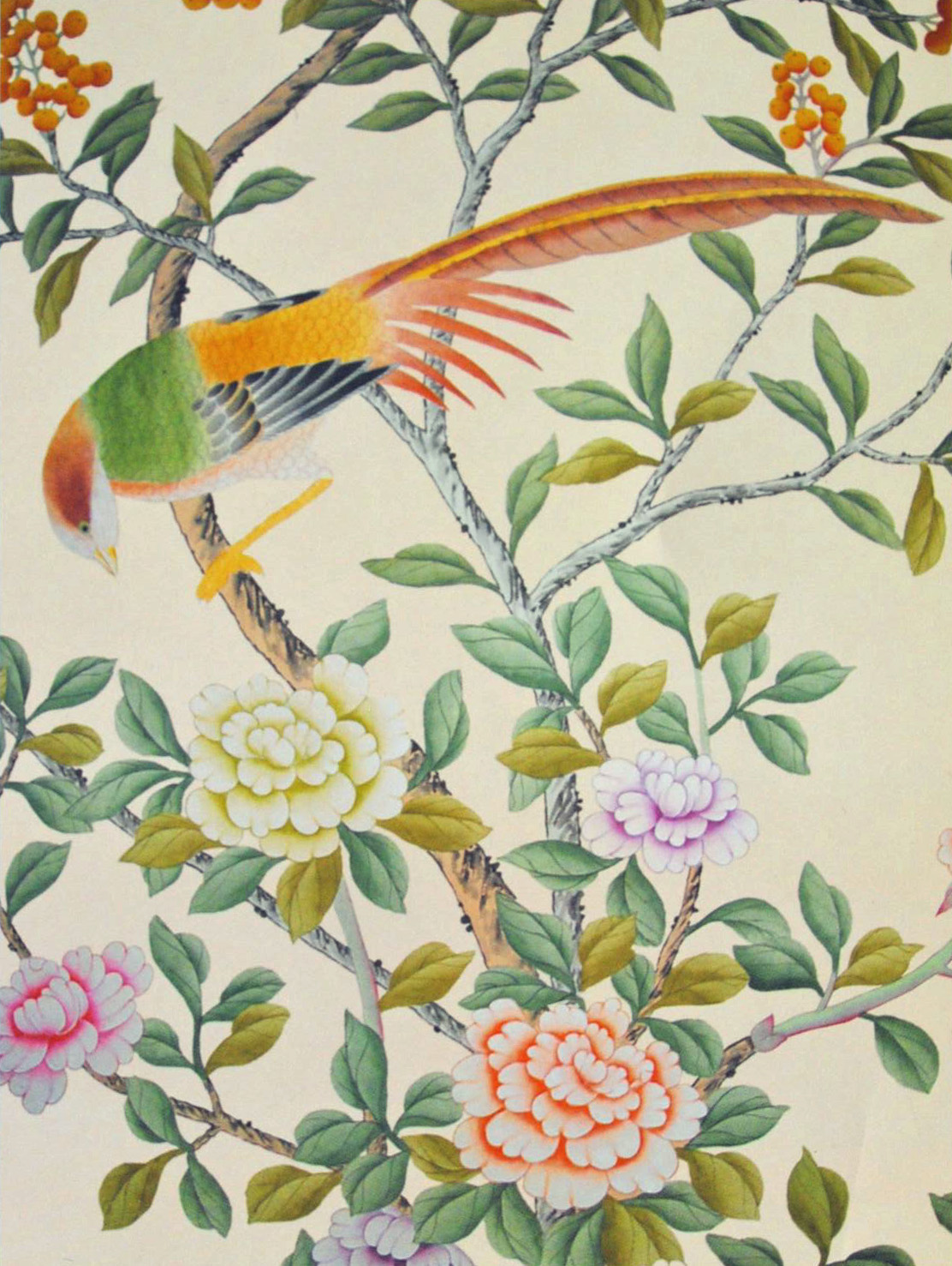 Description: A painting of a bird sitting on a tree branch with flowers and leaves around it.