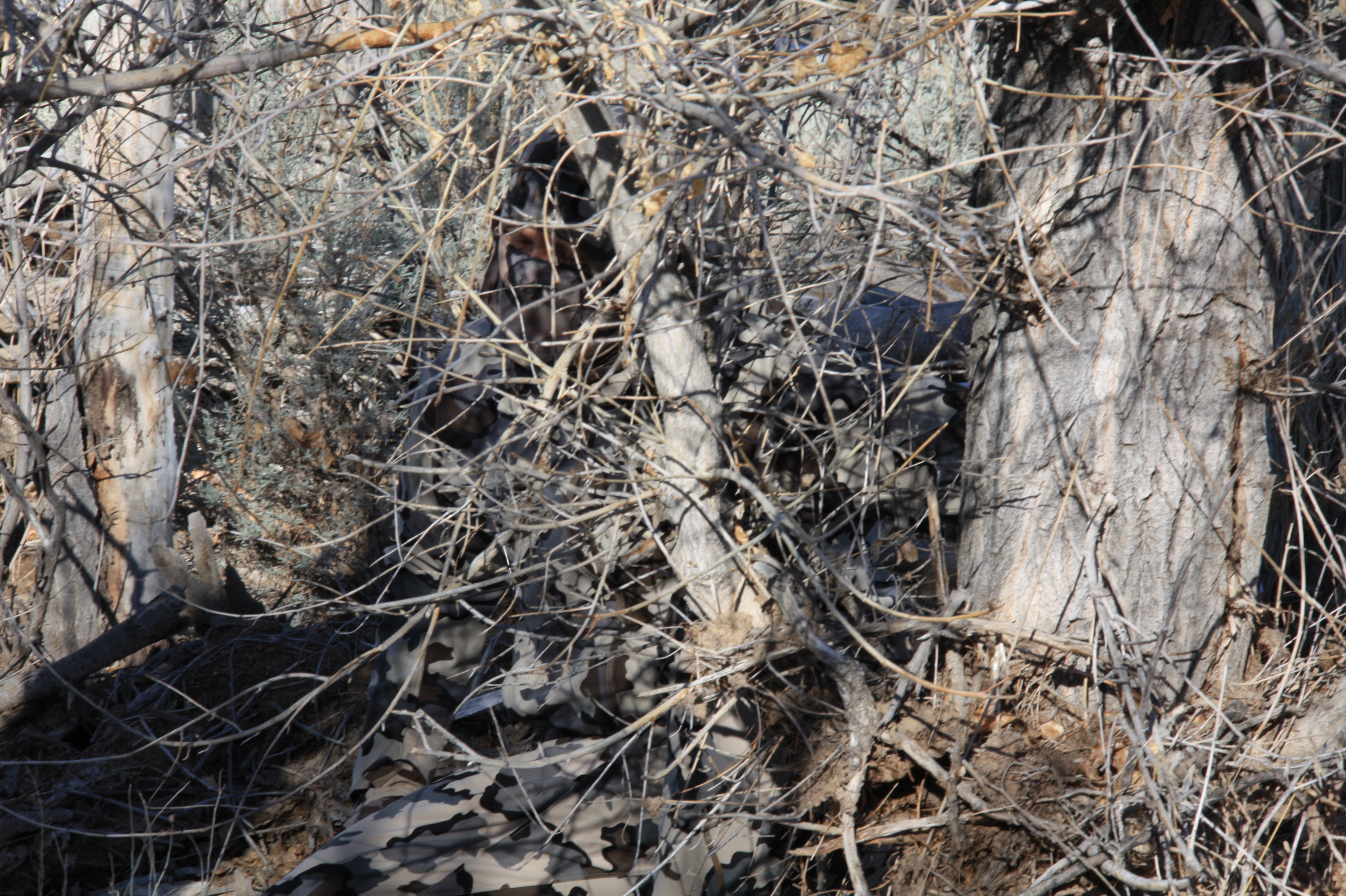 Description: A bird is sitting on a tree branch in the woods with no leaves on it's branches and a dead bird is in the foreground.