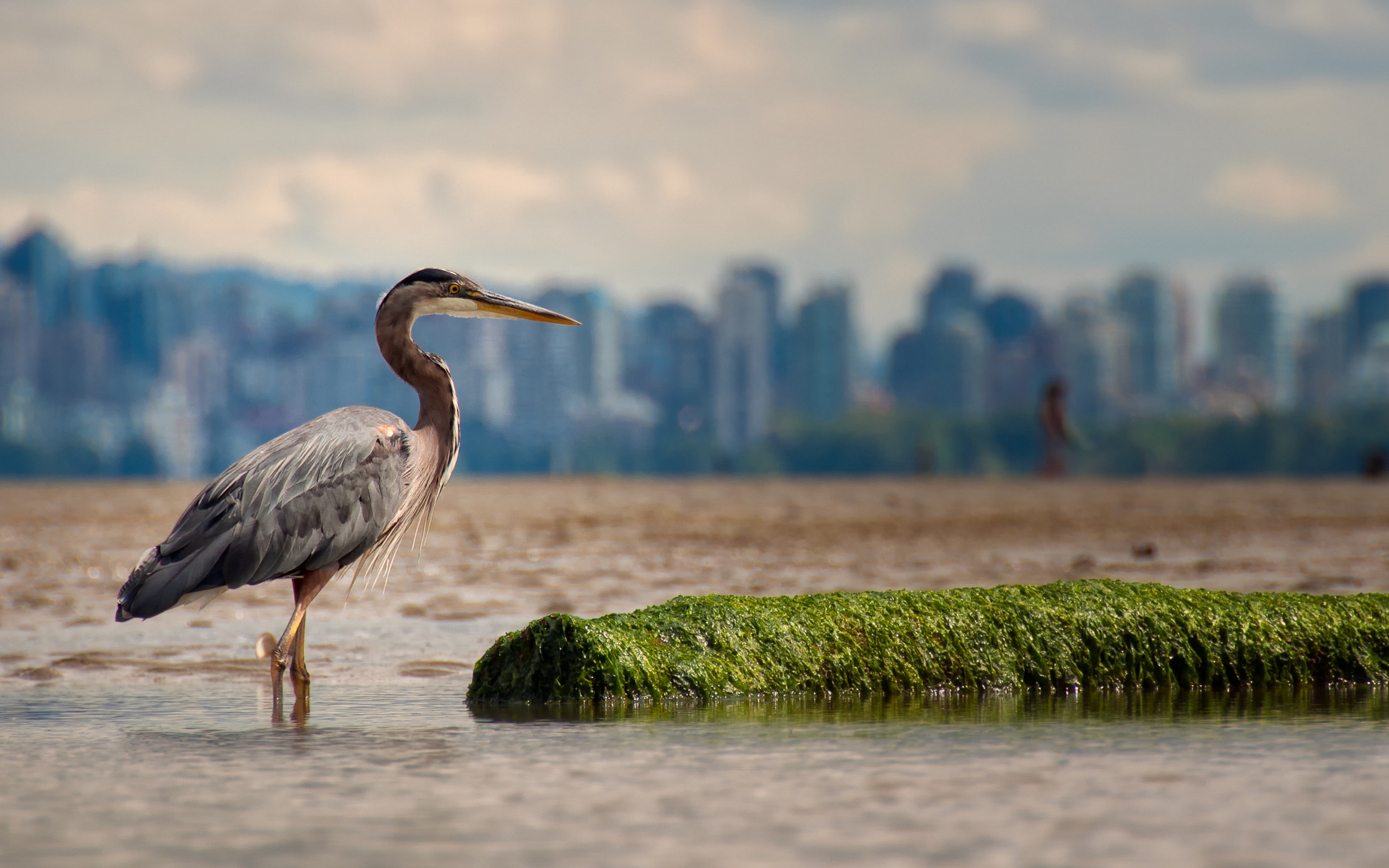 Description: A bird standing in the water near a grassy patch of land with a city in the background on a cloudy day.