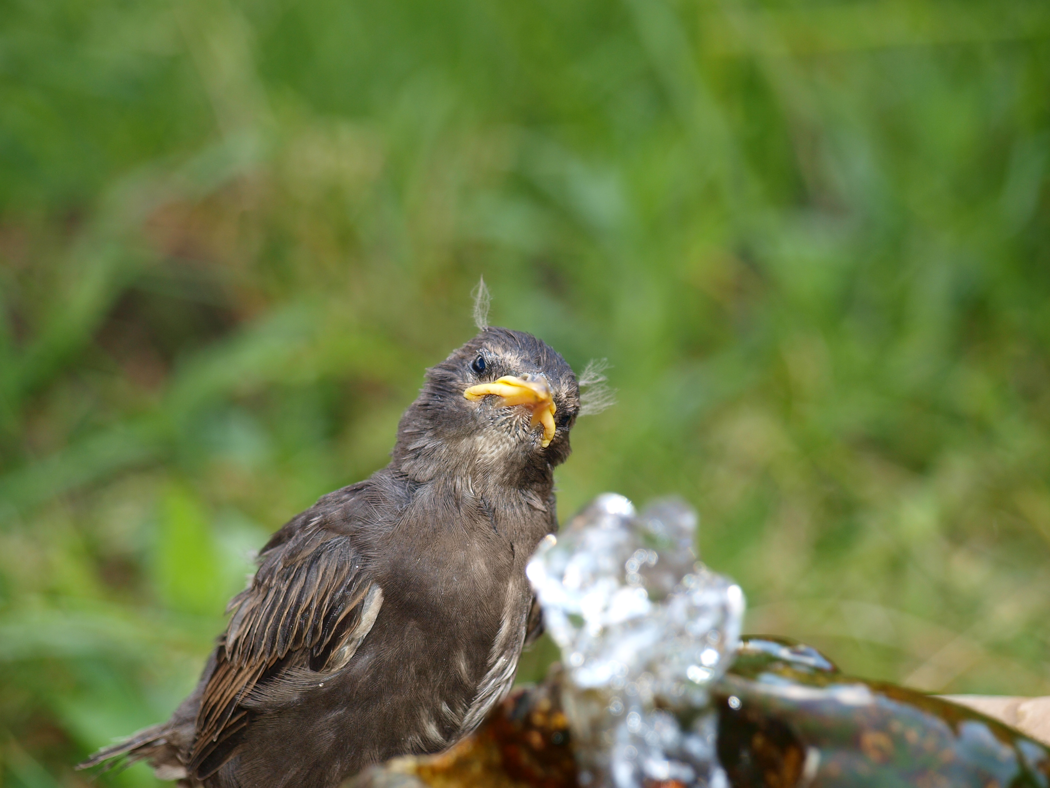 Description: A bird is sitting on a piece of wood with a water fountain in the background and grass in the background.
