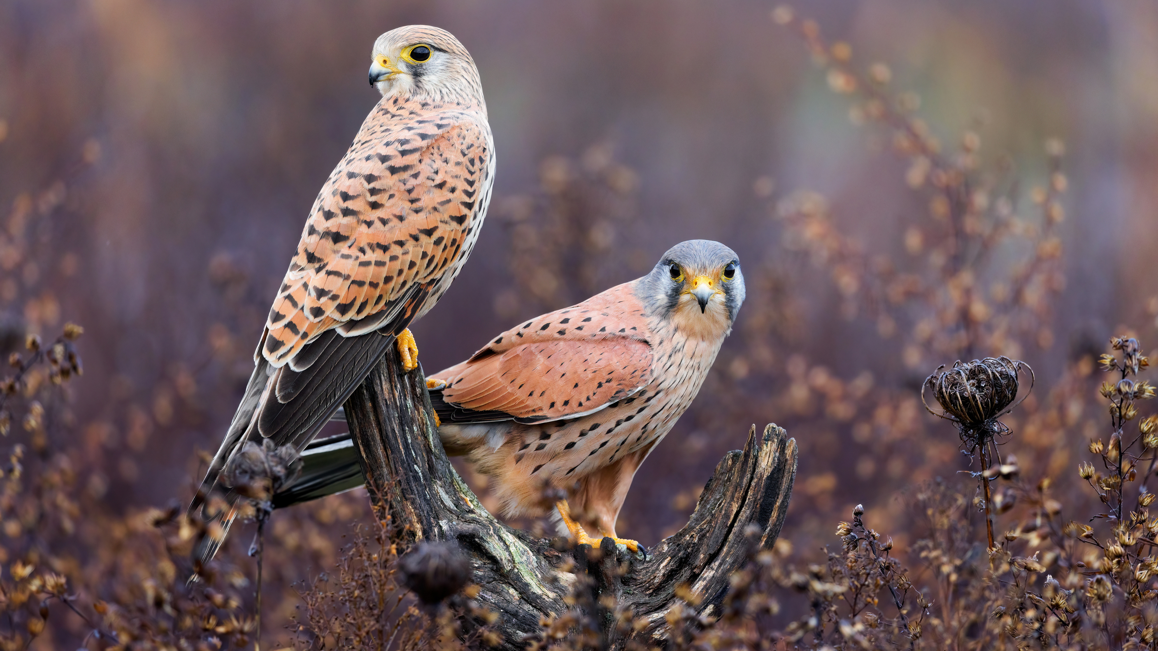 Description: Two birds are perched on a branch in a field of tall grass and weeds.