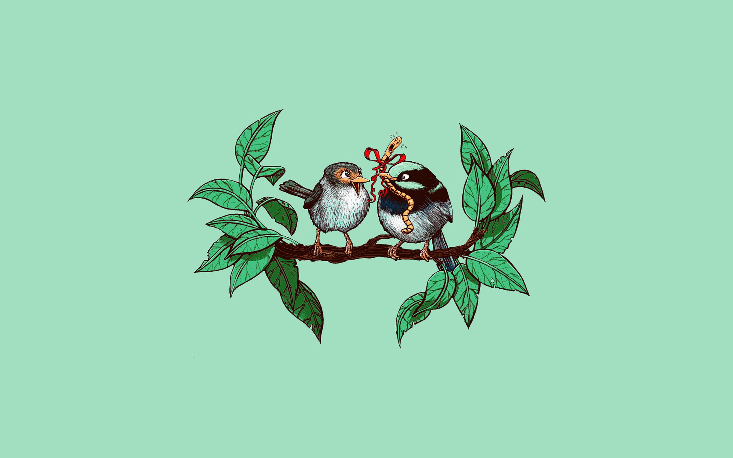 Description: Two birds sitting on a branch with leaves on it's sides.