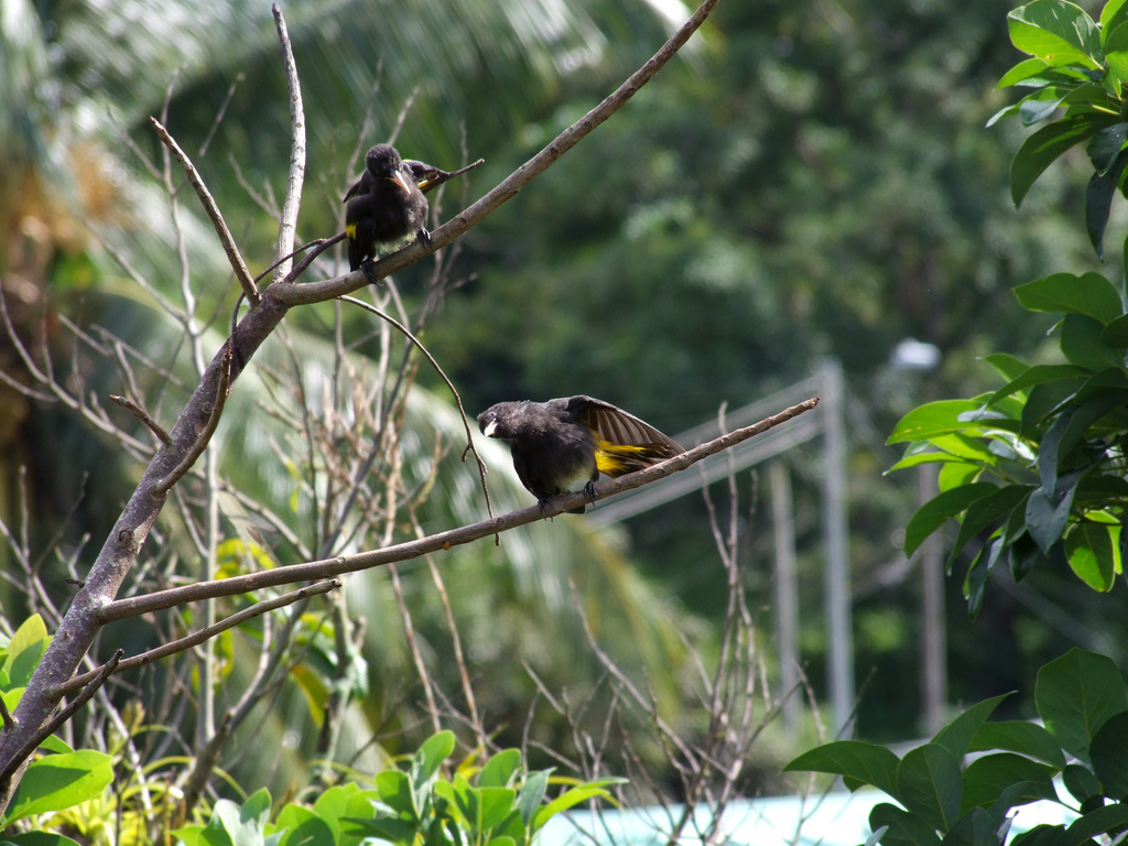 Description: Two birds perched on a branch in a tree with leaves around them and a fence in the background with a blue pool in the foreground.