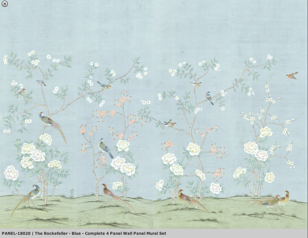 Description: A painting of birds and flowers on a blue background with a sky background and a white flowered tree.