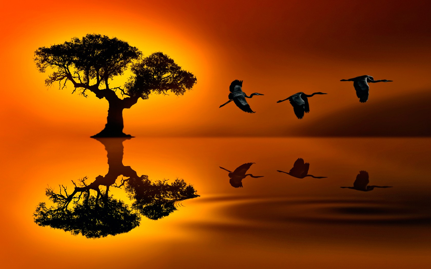 Description: A flock of birds flying over a lake at sunset with a tree in the foreground and a sunset in the background.