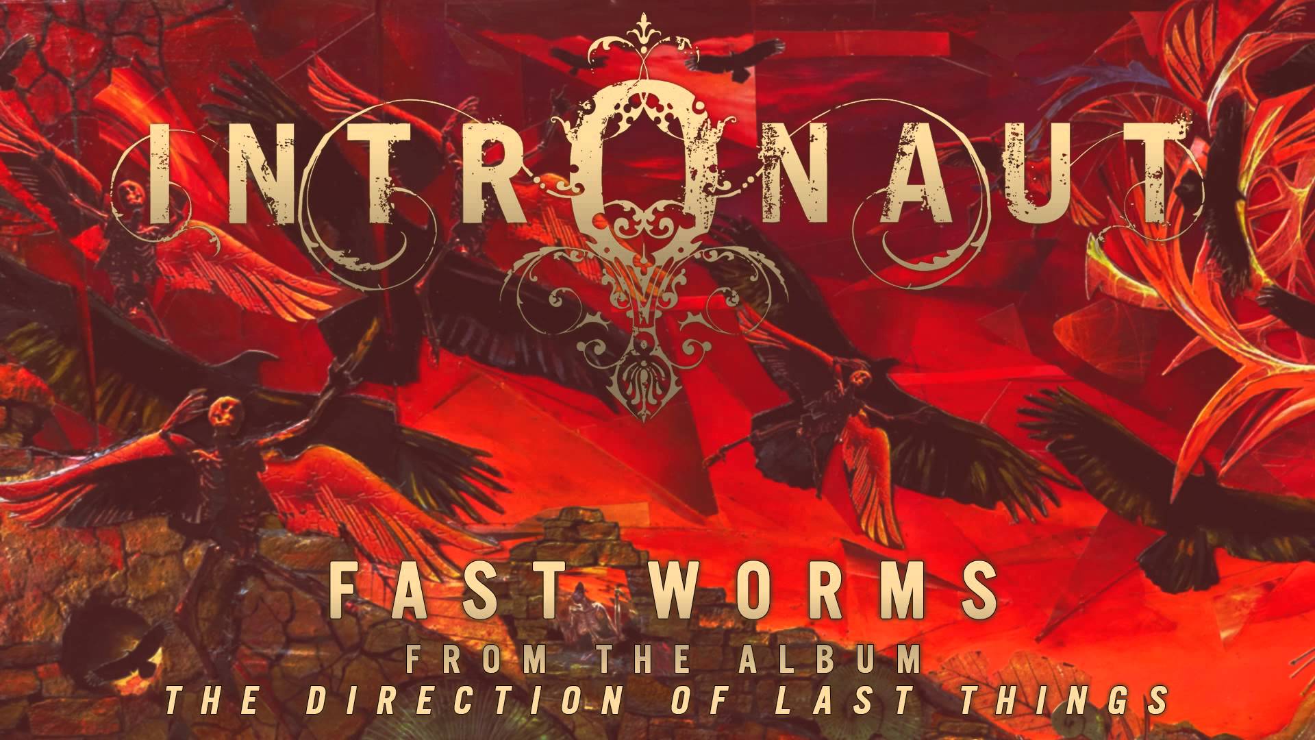 Description: A painting of a group of birds flying over a red background with the words.