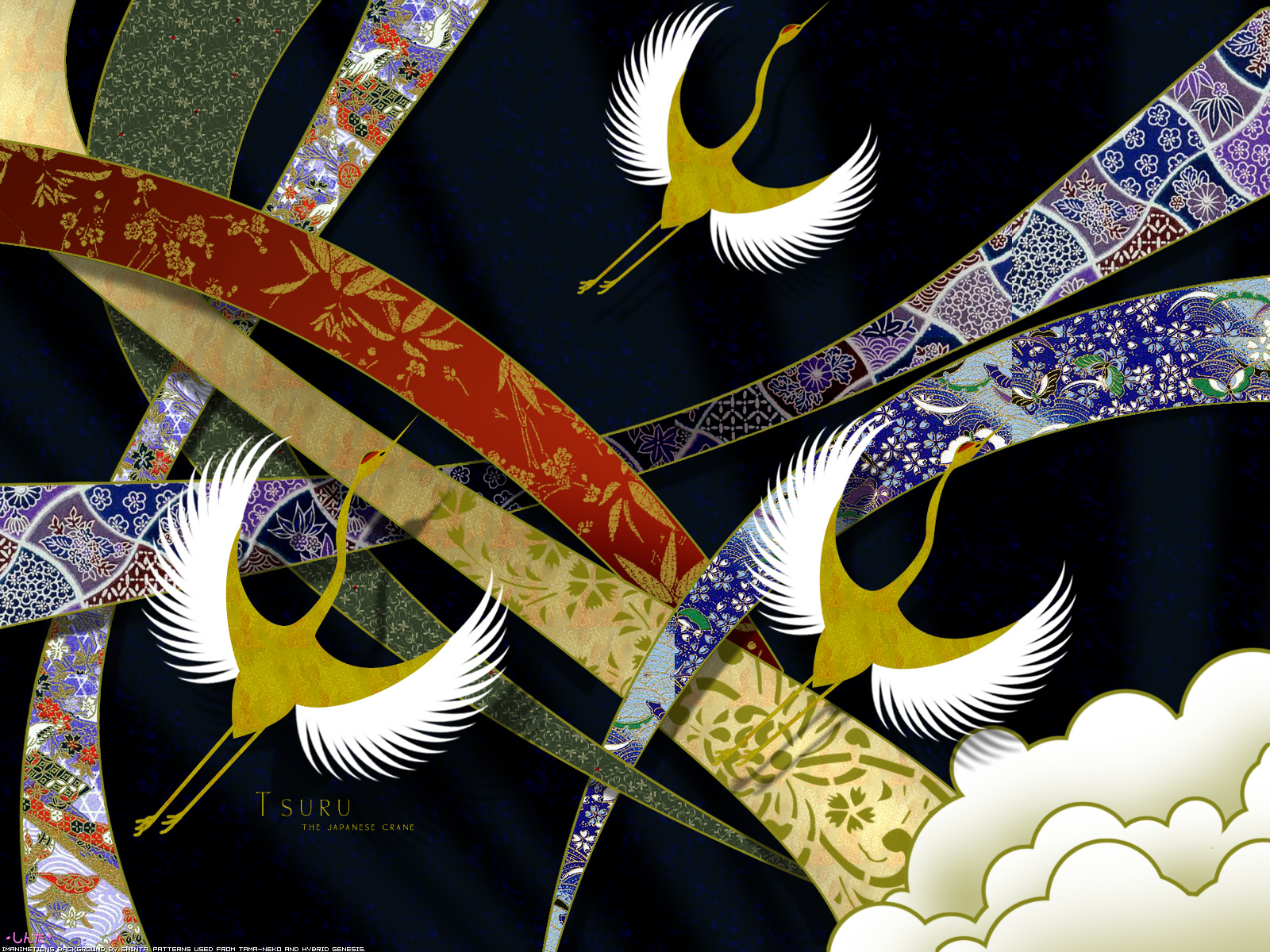 Description: A painting of two birds flying through the sky with a red ribbon in the foreground and a blue sky with clouds in the background.