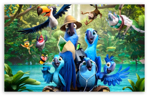 Description: A group of birds flying over a river in the jungle with a man on top of them and birds flying around.