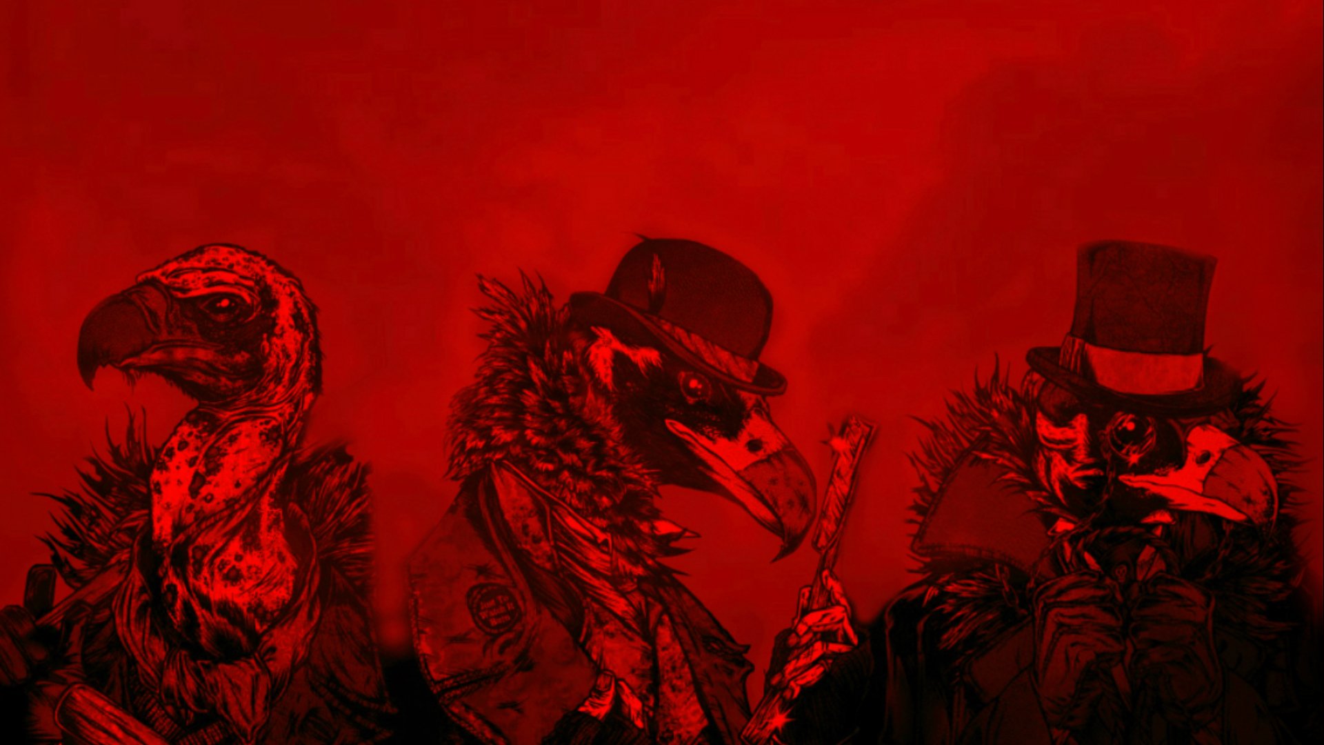 Description: Three birds wearing hats and coats with a red background and a red background with a black border and a red background with a red border.