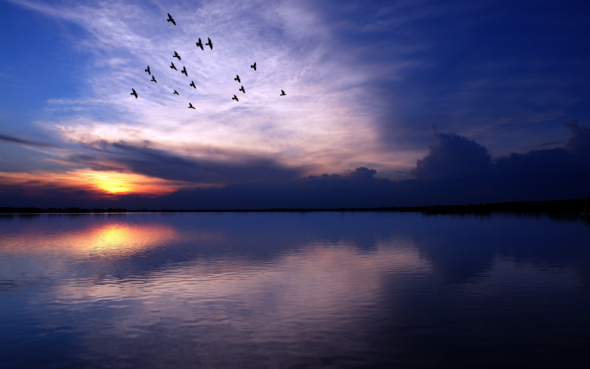 Description: A flock of birds flying over a lake at sunset or dawn with a flock of birds flying over the water.
