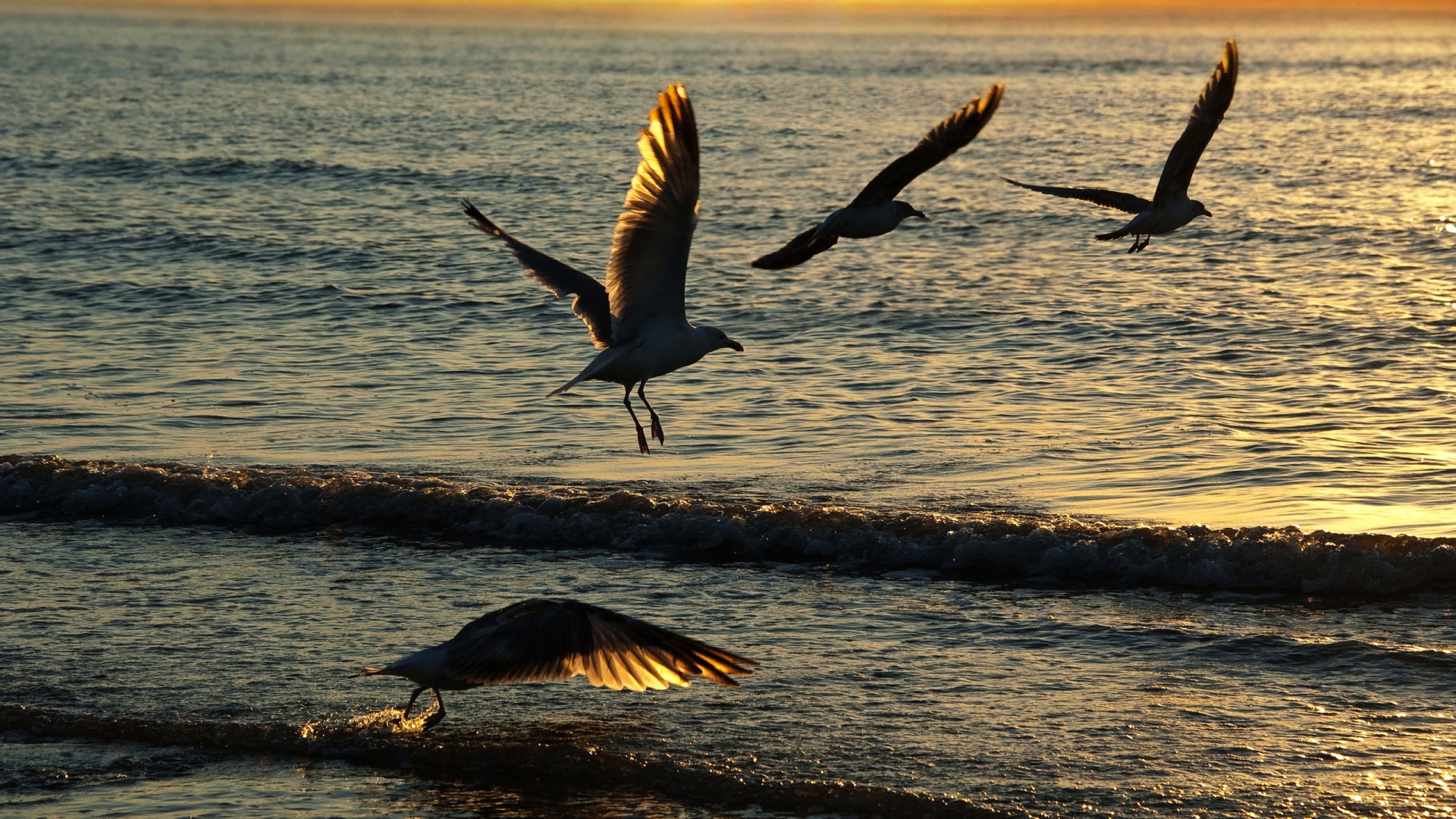 Description: A couple of birds flying over the ocean at sunset or dawn or dawn time.