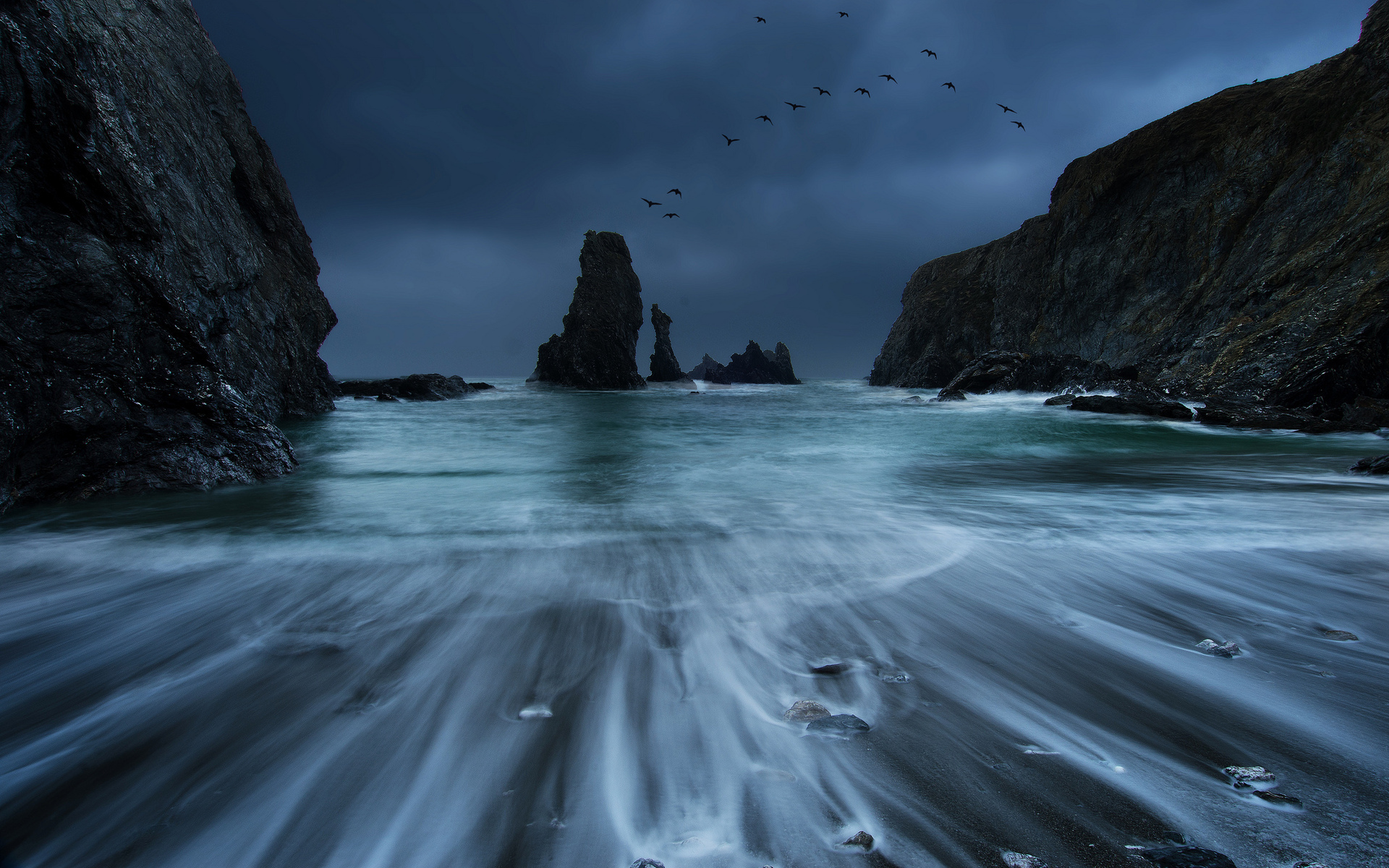 Description: A group of birds flying over a body of water near a rocky cliff face at night with a dark sky.