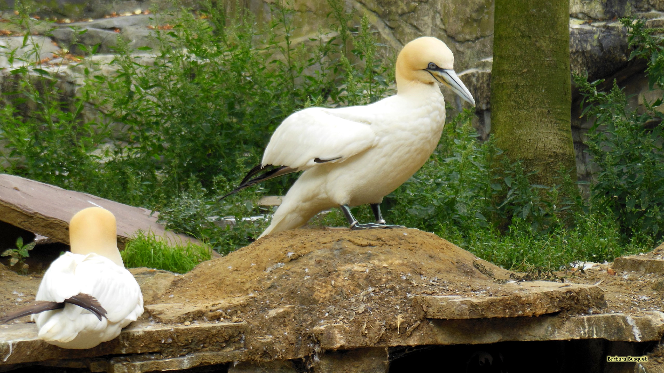 Description: A couple of birds that are standing on a rock in the grass and some trees in the background and a rock wall.