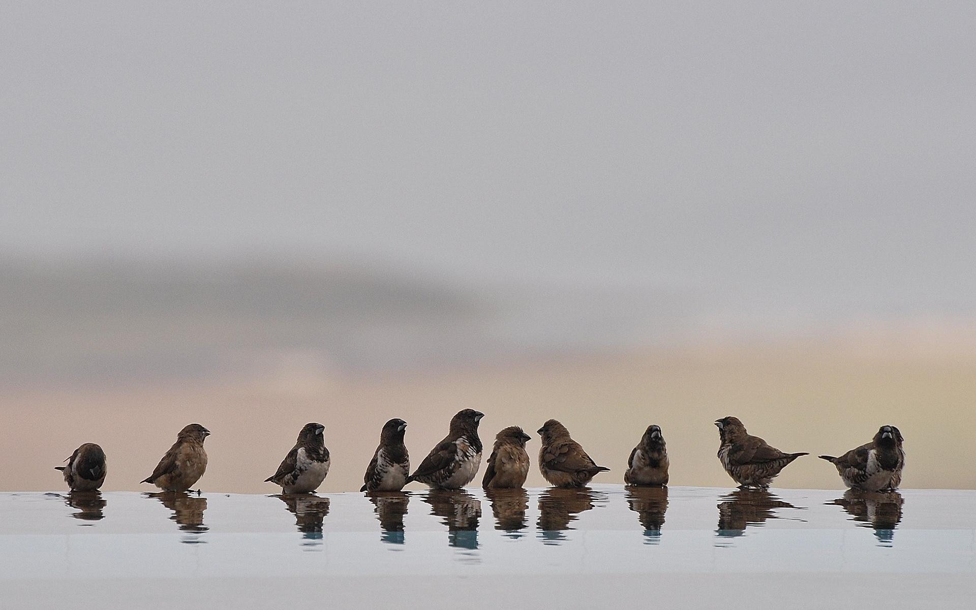 Description: A group of birds standing on top of a body of water next to each other on a cloudy day.