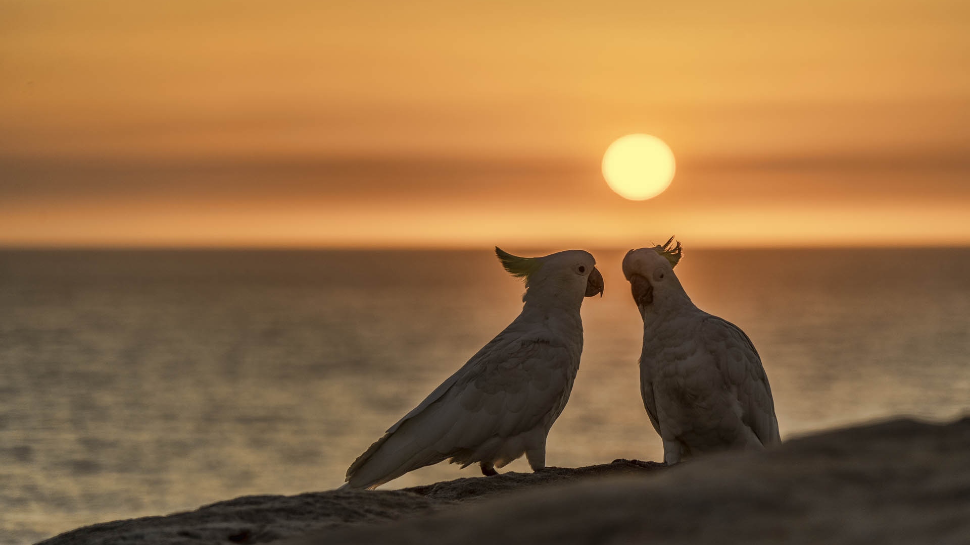 Description: Two birds are sitting on a rock near the ocean at sunset or sunrise time.