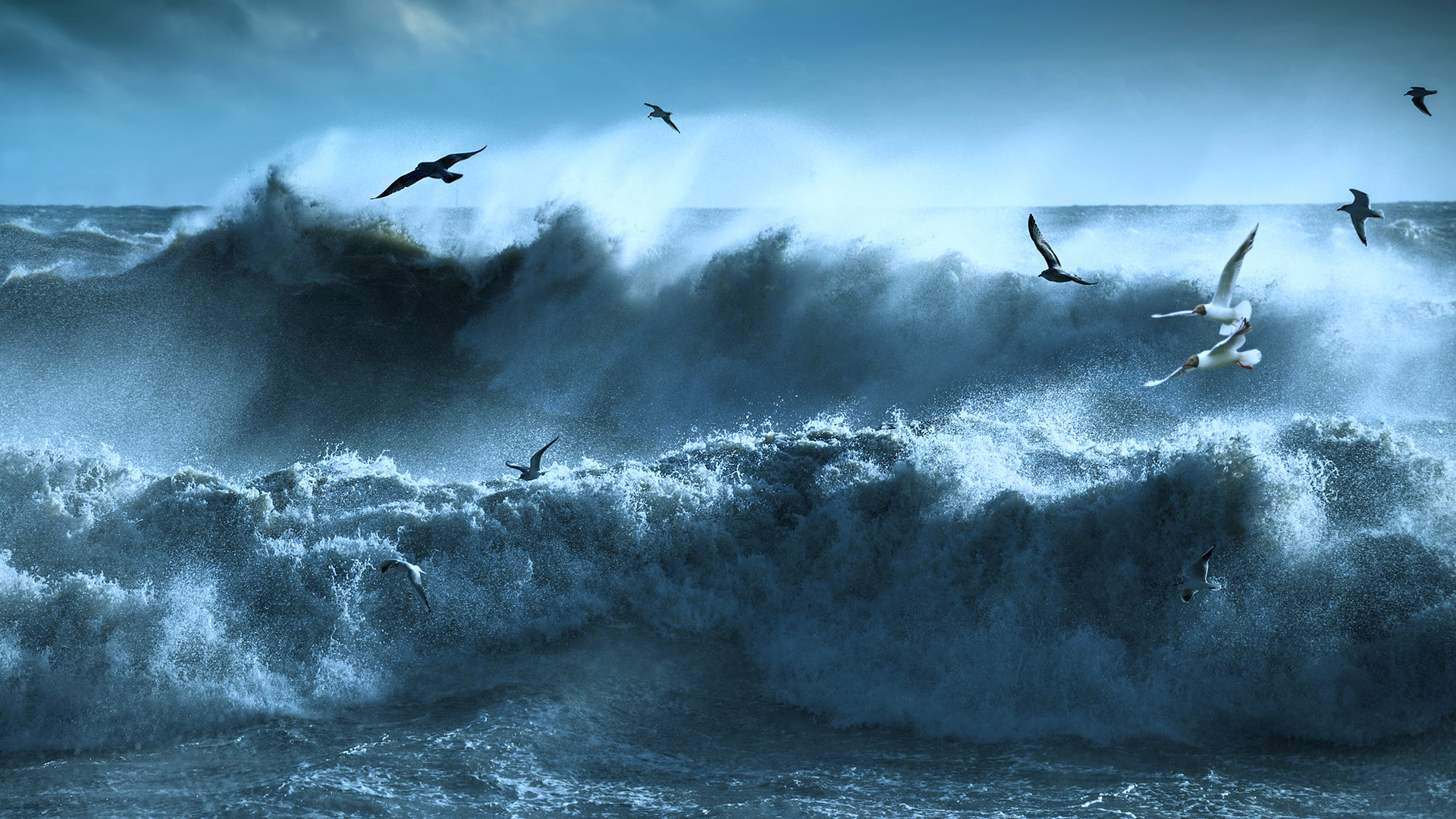Description: A flock of birds flying over a large wave in the ocean with a bird flying above it and a bird flying above it.