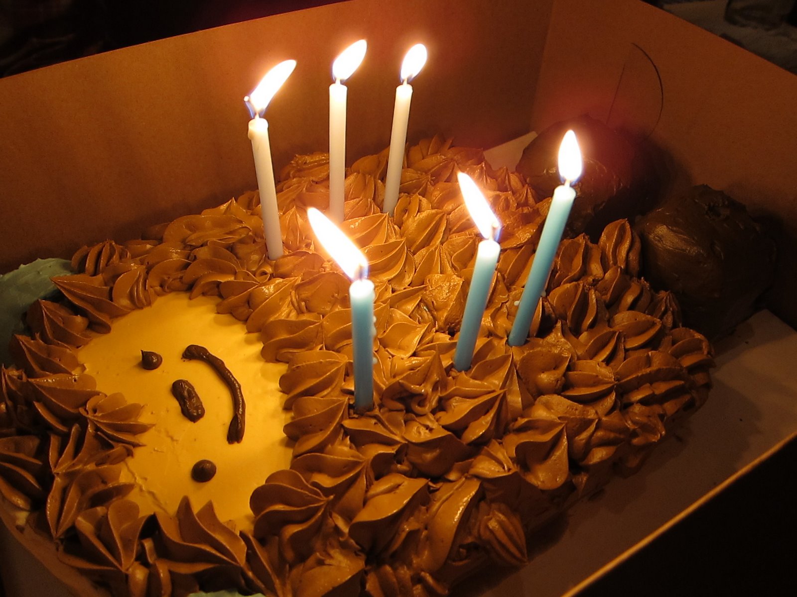Description: A birthday cake with candles in a box with a smiley face on it and a few other candles sticking out of it.