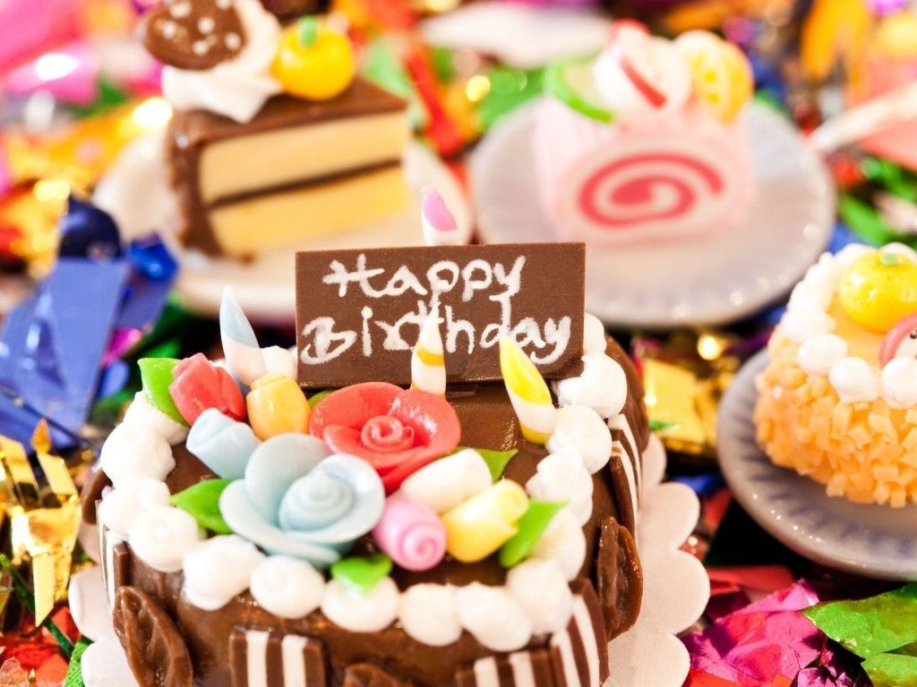 Description: A birthday cake with a happy birthday sign on it sitting on a table of confetti and other decorations.