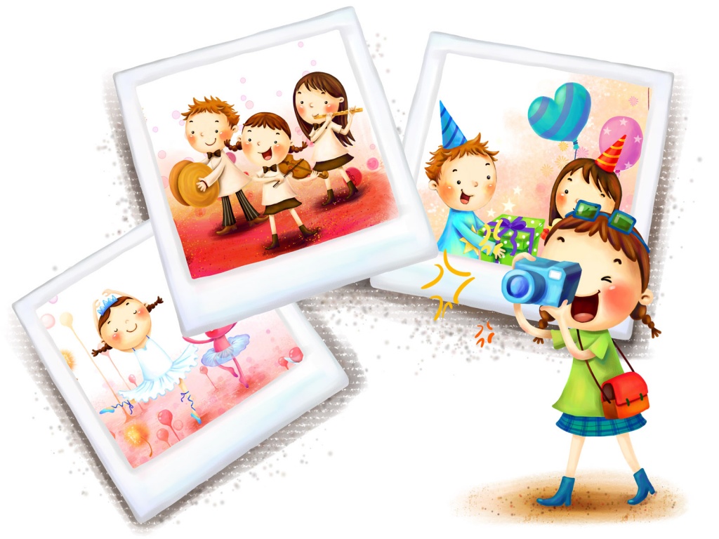 Description: A girl taking pictures of a birthday card with a camera and balloons and a boy with a birthday hat.