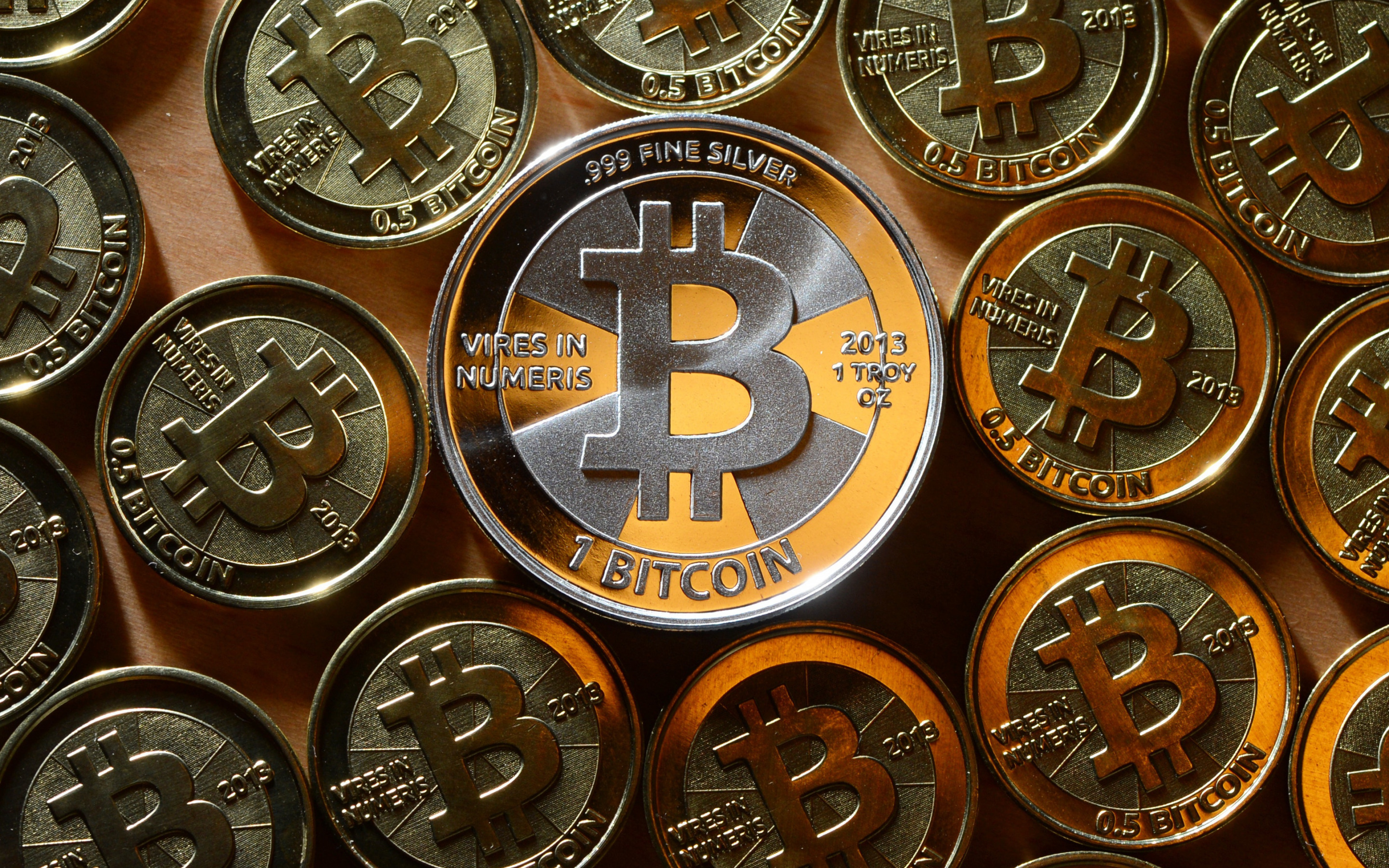 Description: A bitcoin coin surrounded by other bitcoins on a table in a pile of coins.
