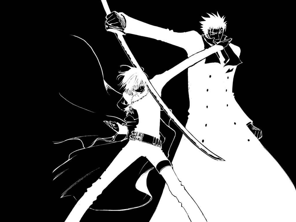 Description: A black and white drawing of two people holding swords and a sword in their hands.