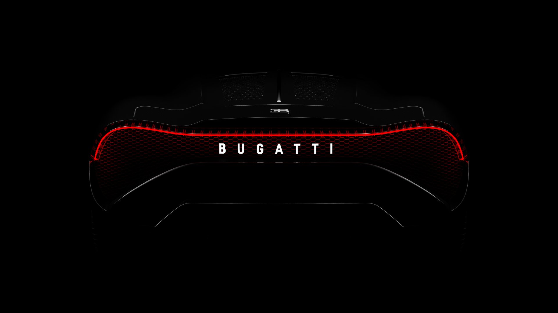 Description: A black background with a red light on the back of a car in the dark with the word bugatti on it.