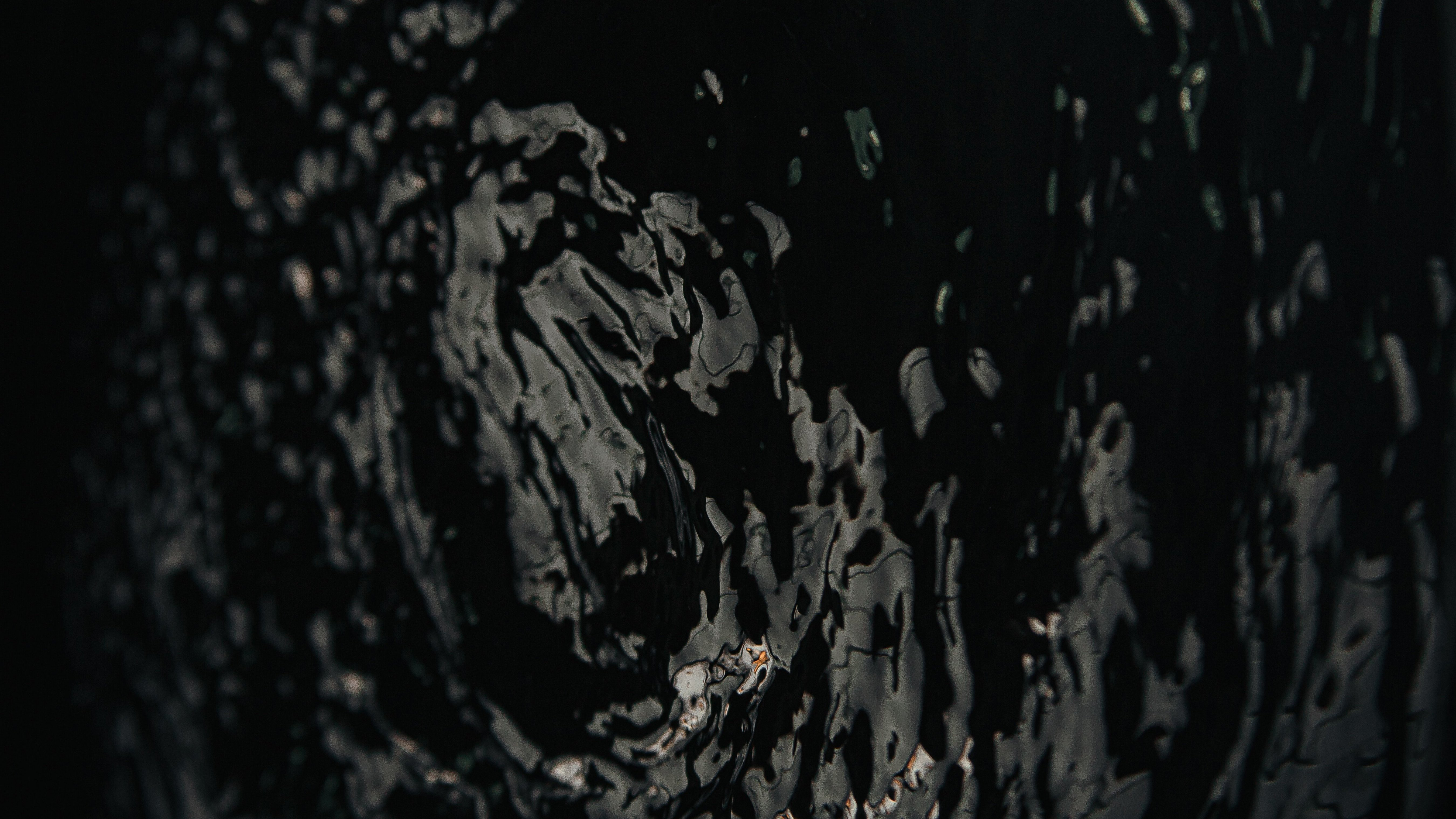 Description: A black background with water droplets and a white frisbee in the center of the image and a black background with water droplets and a white frisbee in the middle.