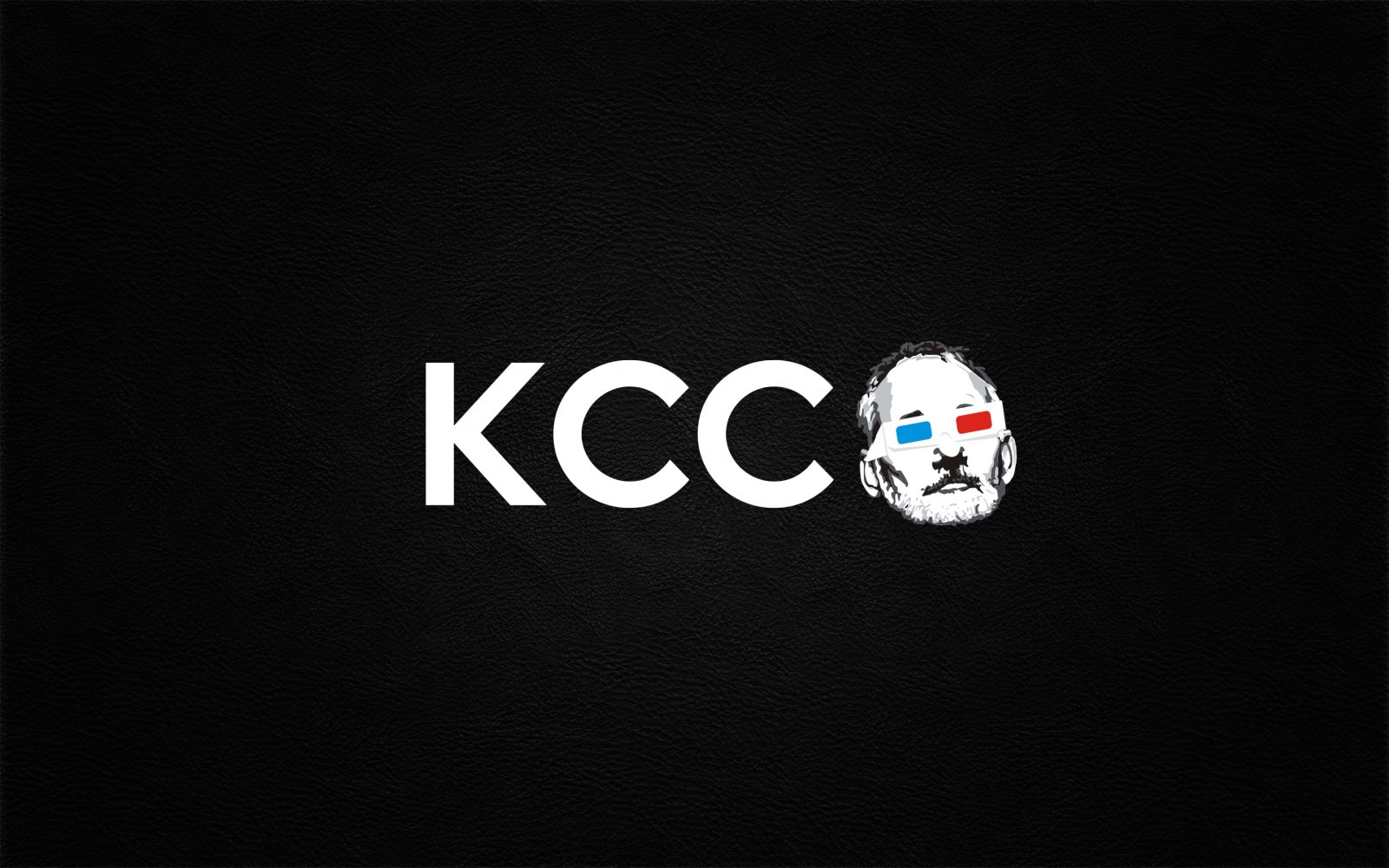 Description: A black background with a white kccc logo on it and a man's face with a red.