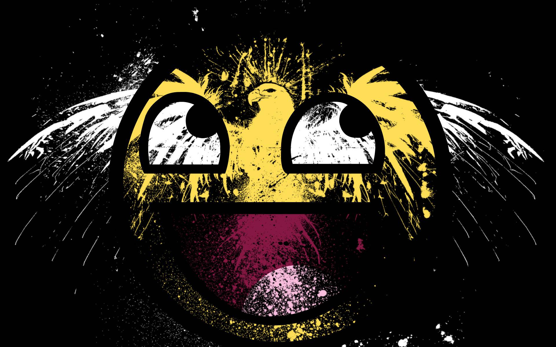 Description: A black background with a yellow and red face with a big smile on it's face and a black background with a red and yellow face with a white outline.