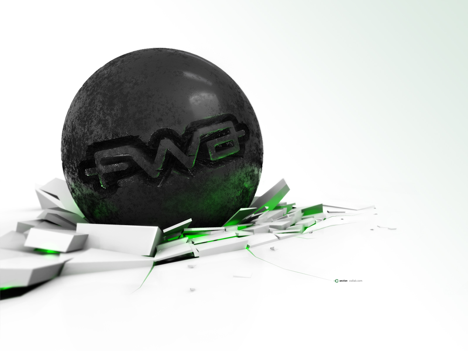 Description: A black ball with the word swf on it is breaking through a white background with a green and black design.
