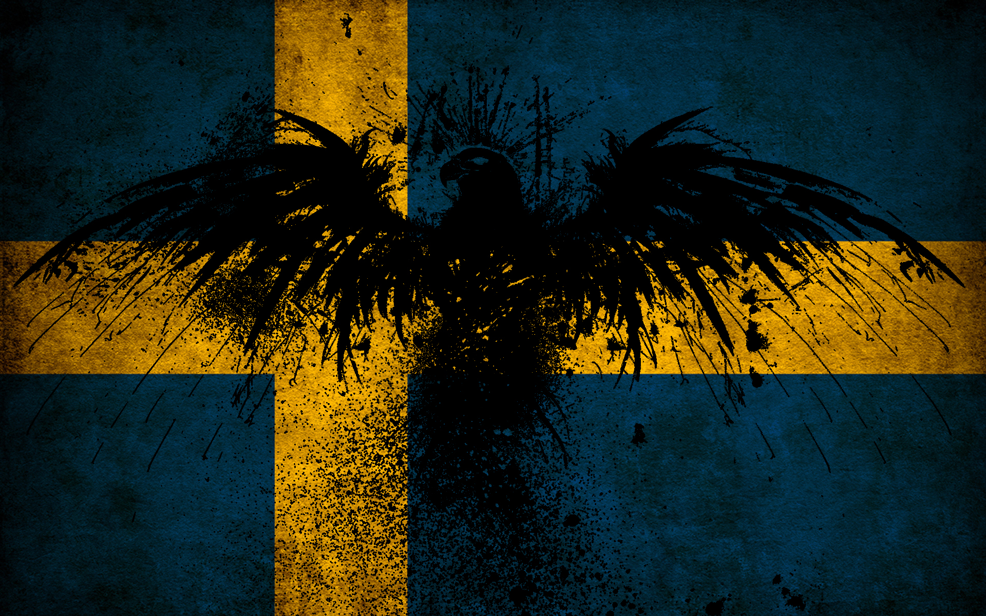 Description: A black bird with a cross on it's chest and wings painted on it's chest and a yellow and blue background.