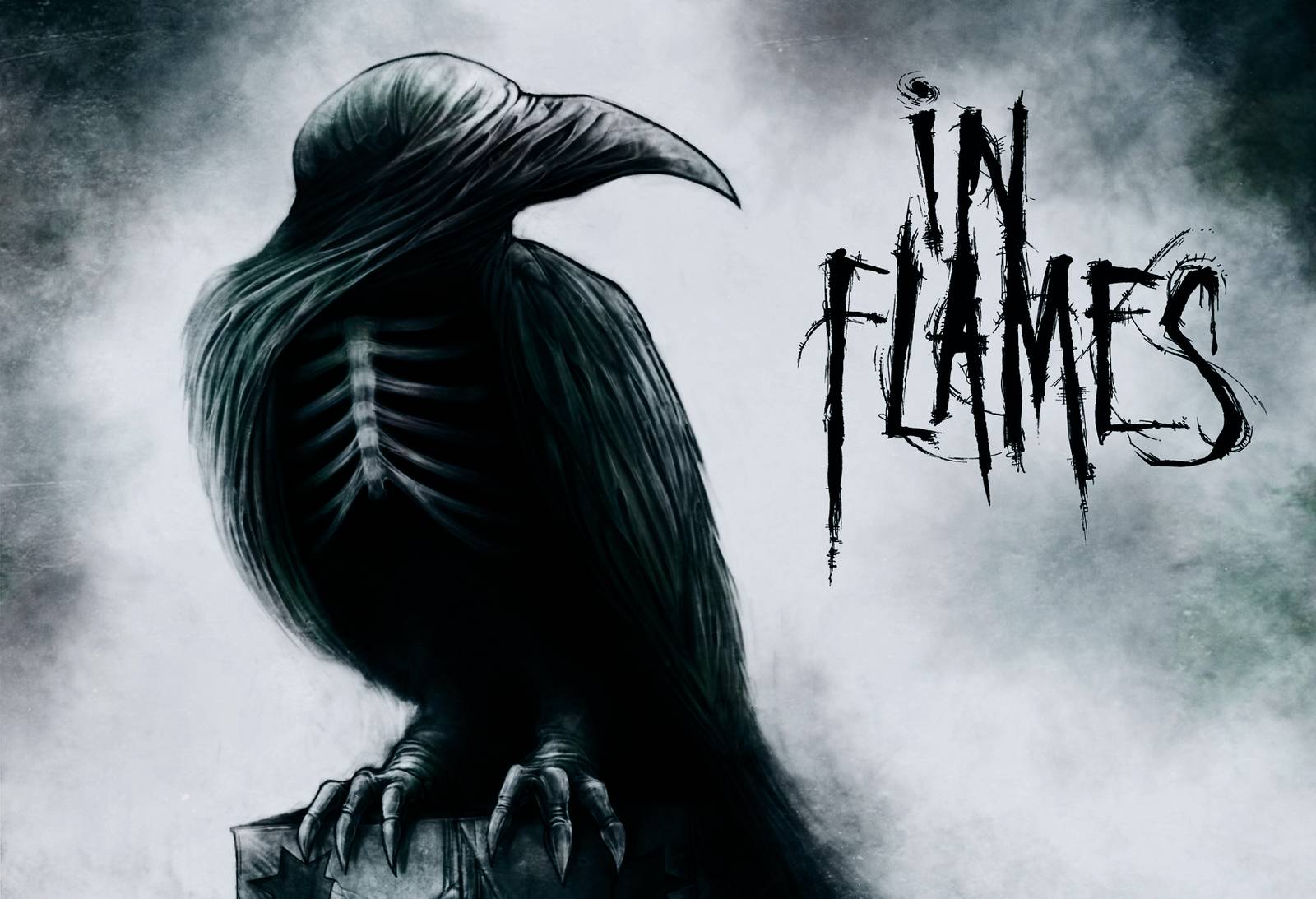 Description: A black bird sitting on top of a wooden fence post in front of a dark sky with the words in flames.