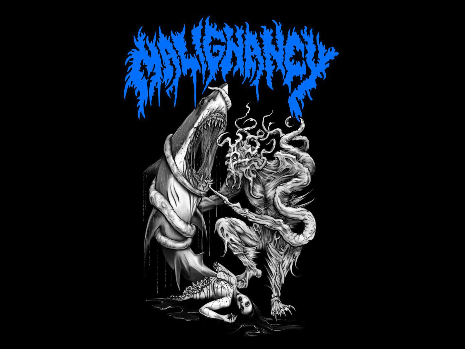 Description: A black and blue shirt with a shark attacking a demon on it's chest and a man in the background.