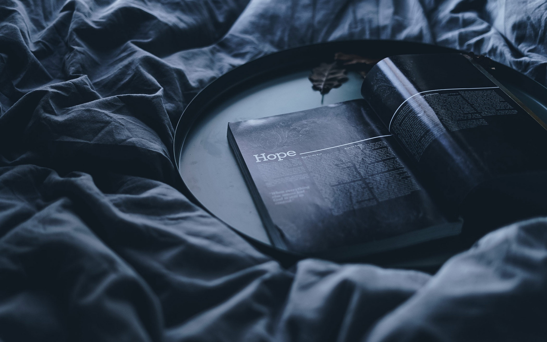 Description: A book is laying on a bed with a black cover and a black plate with a black book on it.