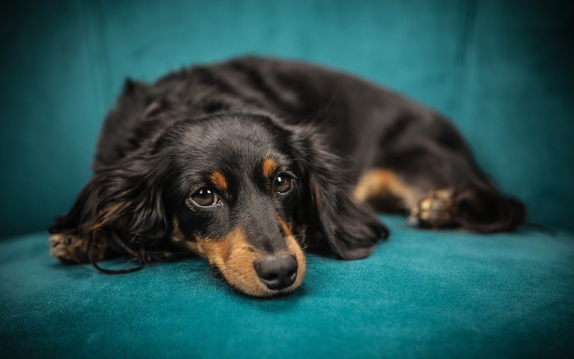 Description: A black and brown dog laying on a blue couch with its head on the arm of a chair and eyes closed.
