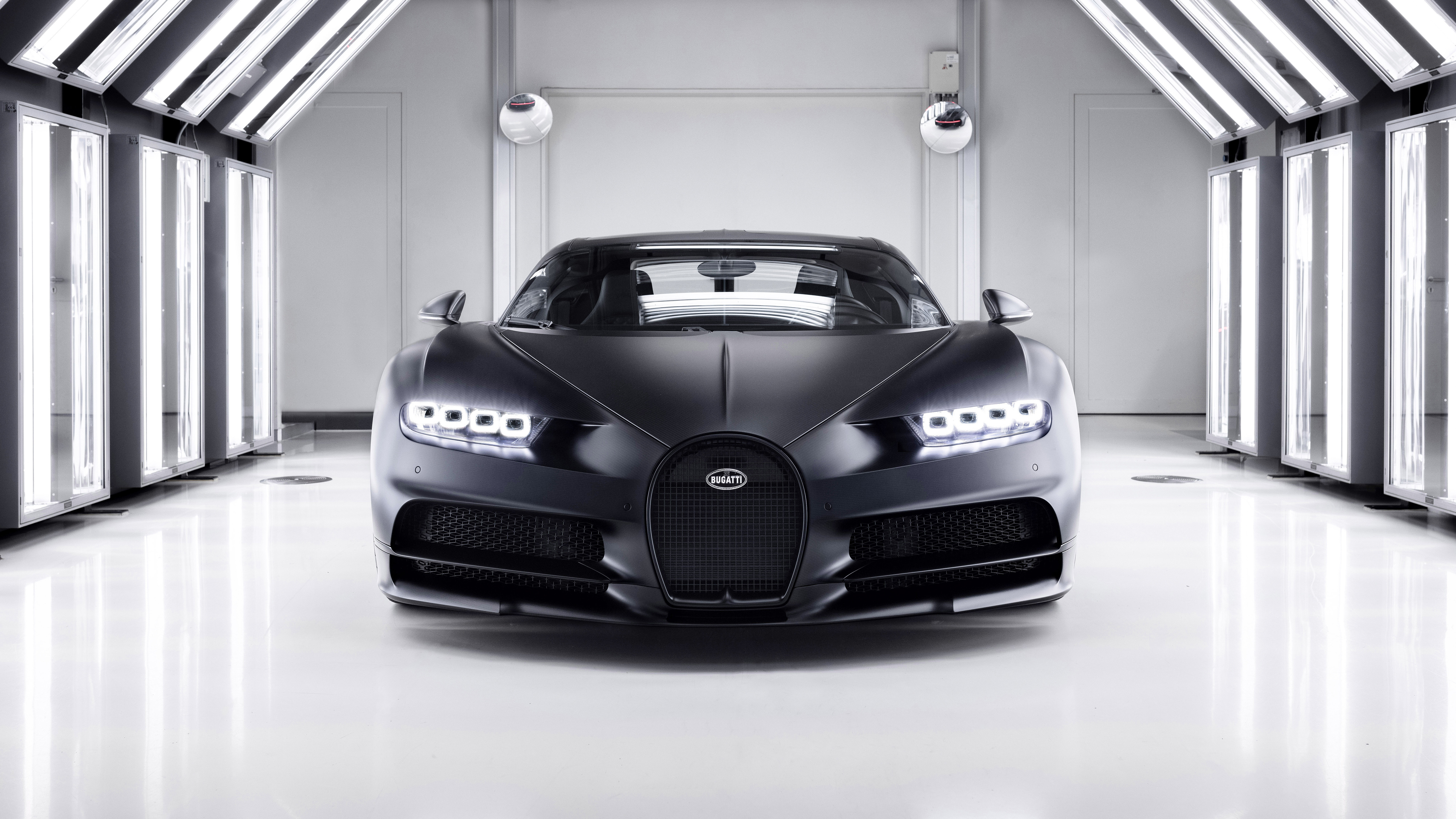 Description: A black bugatti is parked in a garage with white walls and windows on the side of the car.