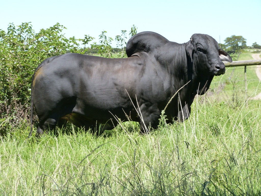 Description: A black bull standing in a field of tall grass next to a fence and bushes with a blue sky in the background.