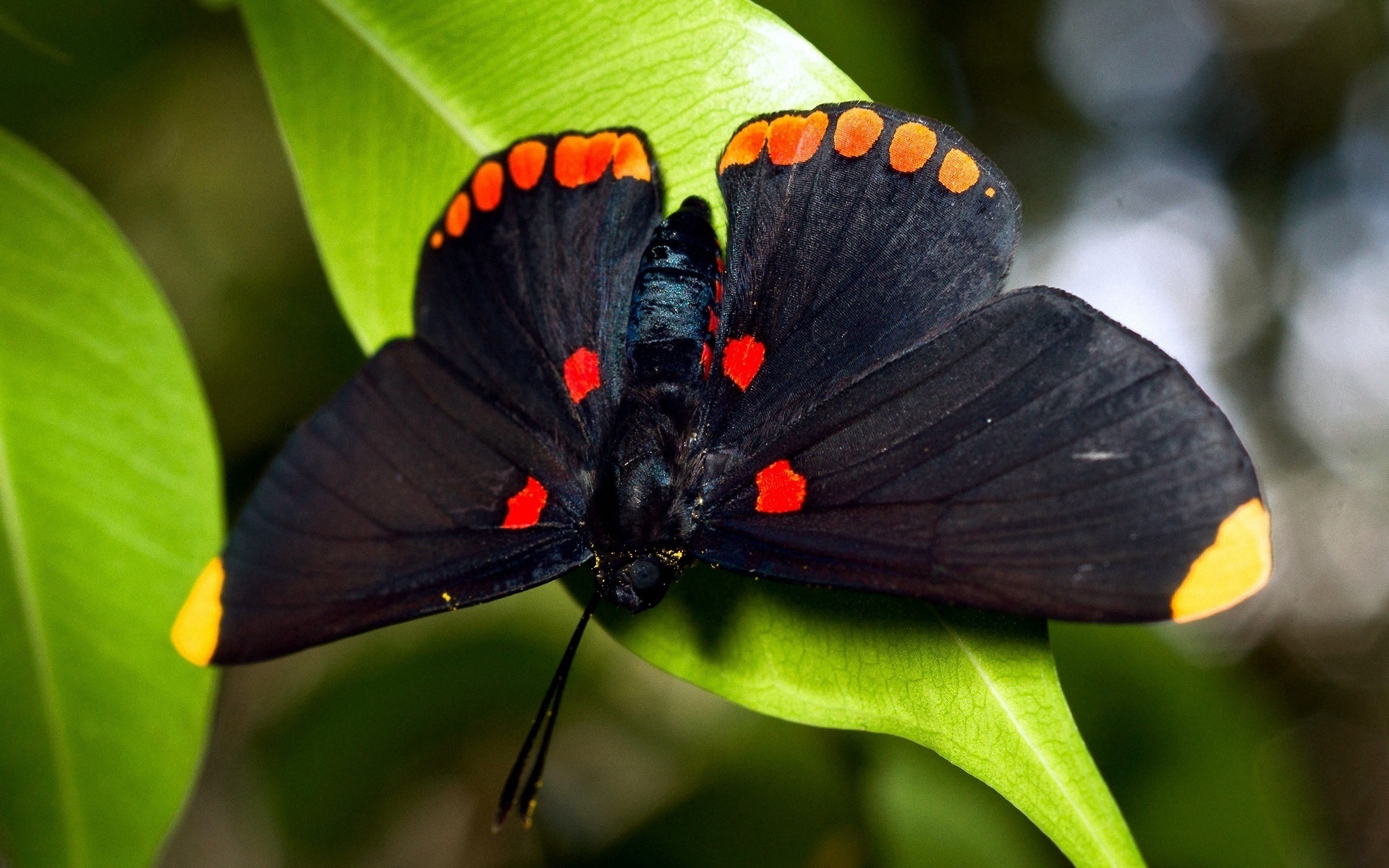 Description: A black butterfly with orange and red spots on its wings sitting on a green leafy branch with leaves.