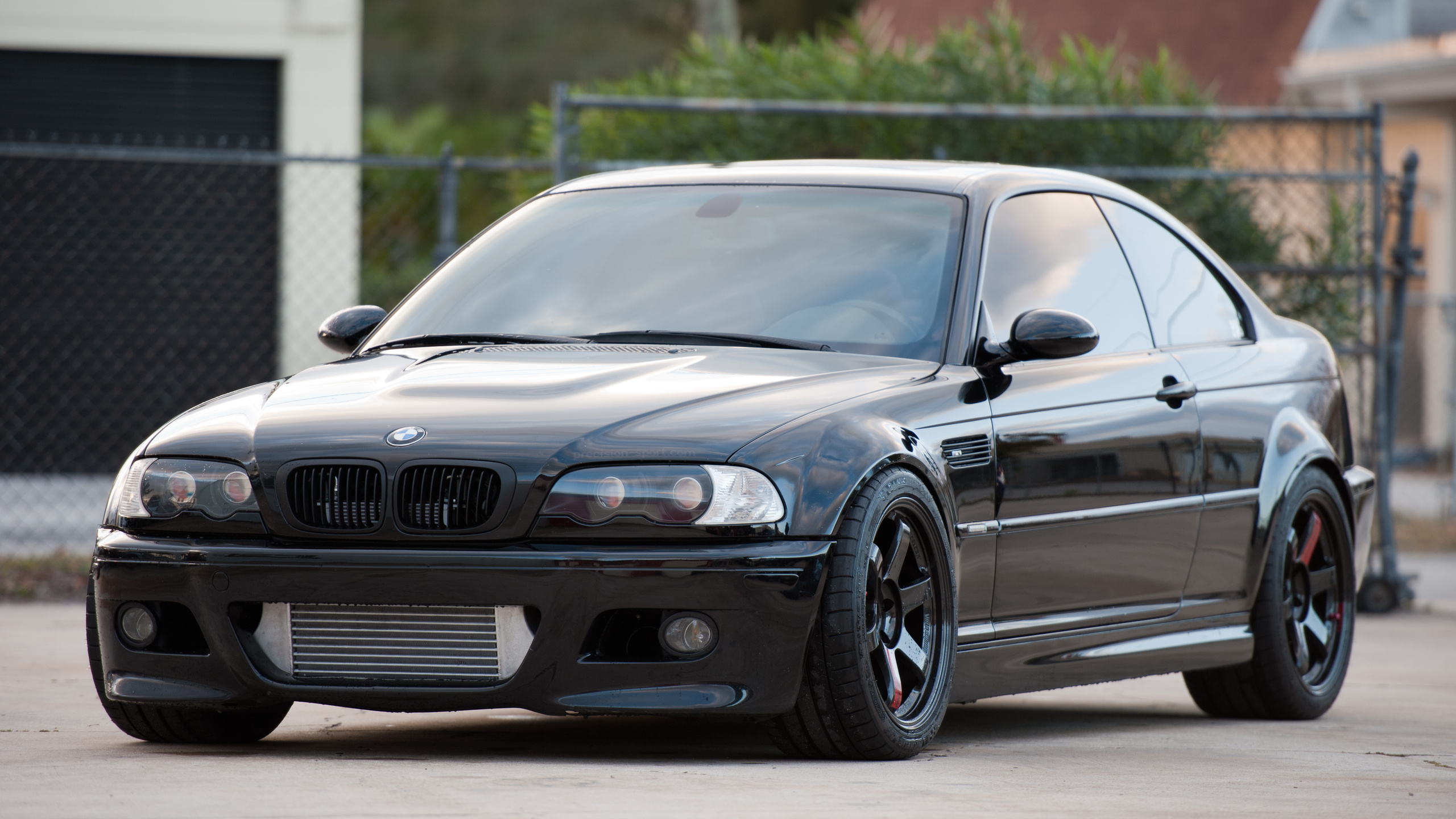 Description: A black car parked in front of a fenced in area with a building in the background and a chain link fence.