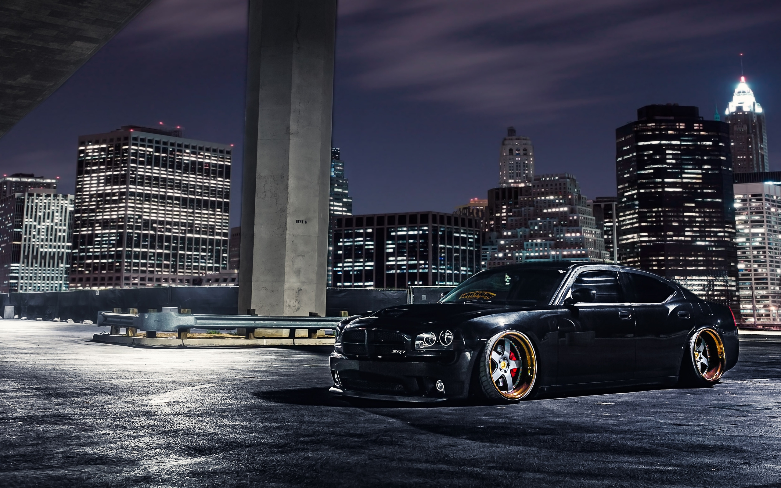 Description: A black car parked in front of a city skyline at night with lights on and a bridge in the background.