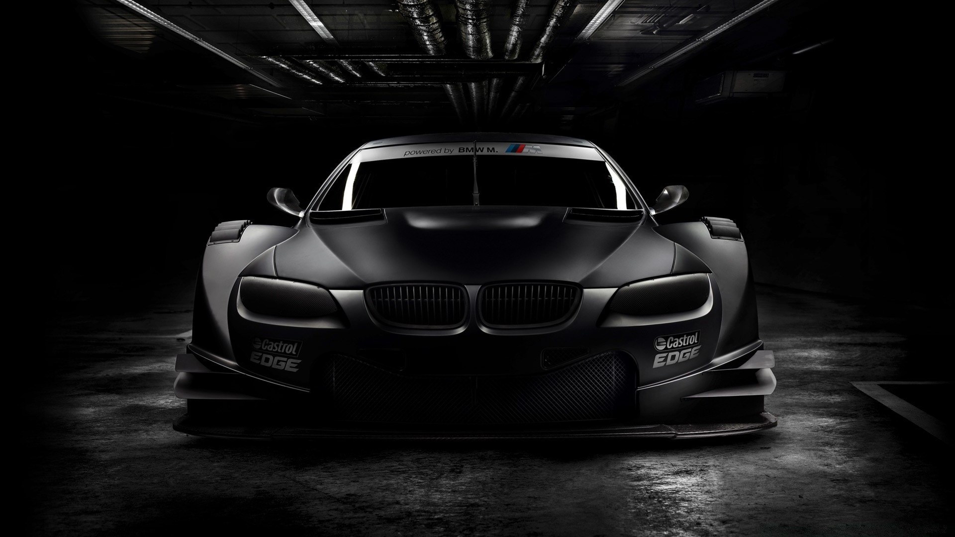 Description: A black car parked in a dark garage with lights on it's sides and a black background with a black background.