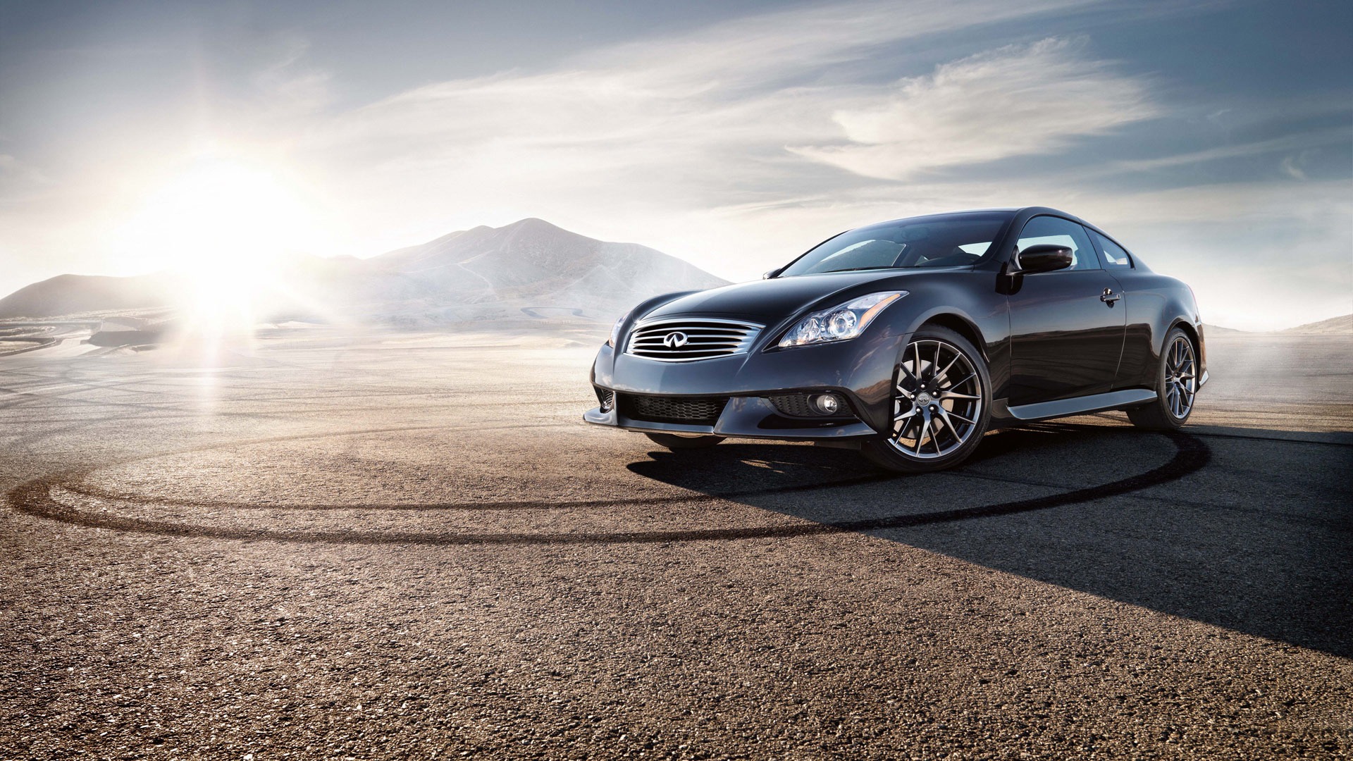 Description: A black car is parked on a road in the desert with mountains in the background and a bright sun shining on the horizon.
