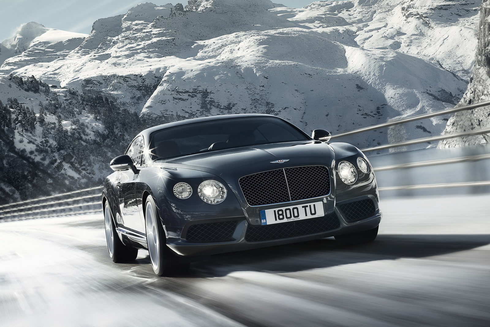 Description: A black car driving down a road next to a mountain range with snow on it's sides and a mountain range in the background.