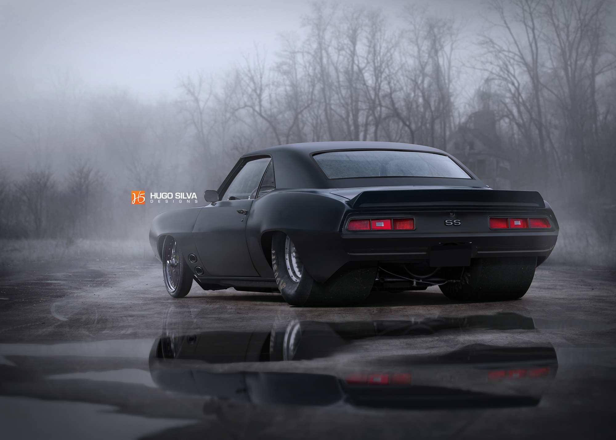 Description: A black car parked in a parking lot on a foggy day with trees in the background and a red light on the taillight.