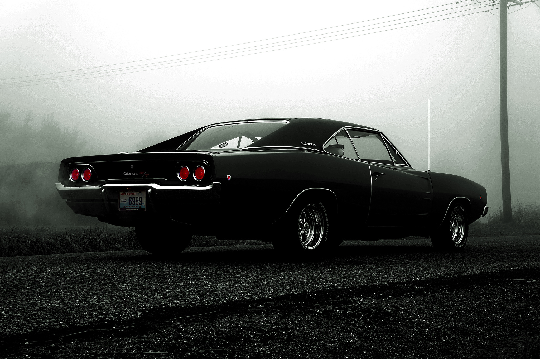 Description: A black car is parked on a foggy road in the dark of night with the headlights on and the tail lights on.