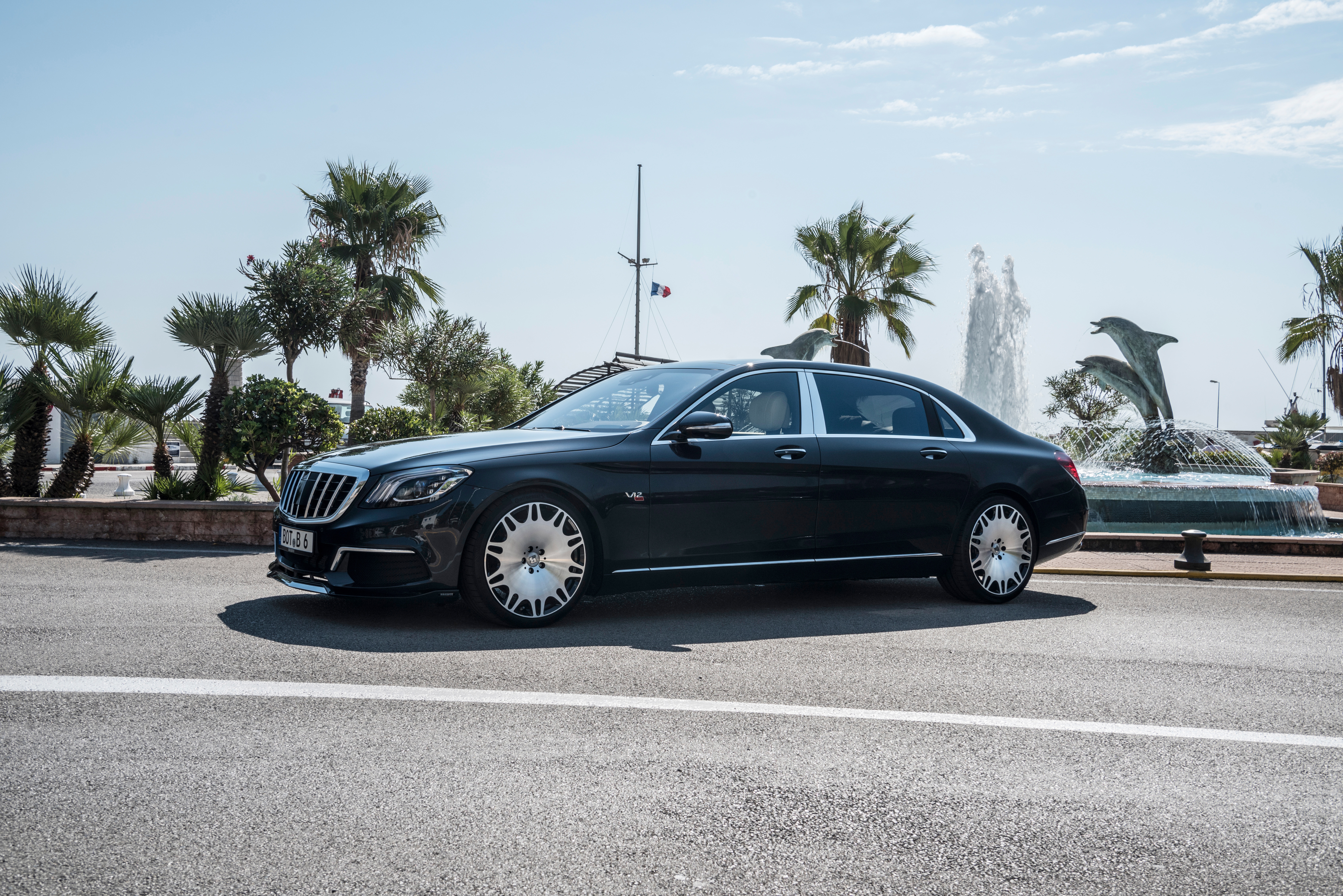 Description: A black car parked in front of a fountain with palm trees in the background and a fountain in the background.
