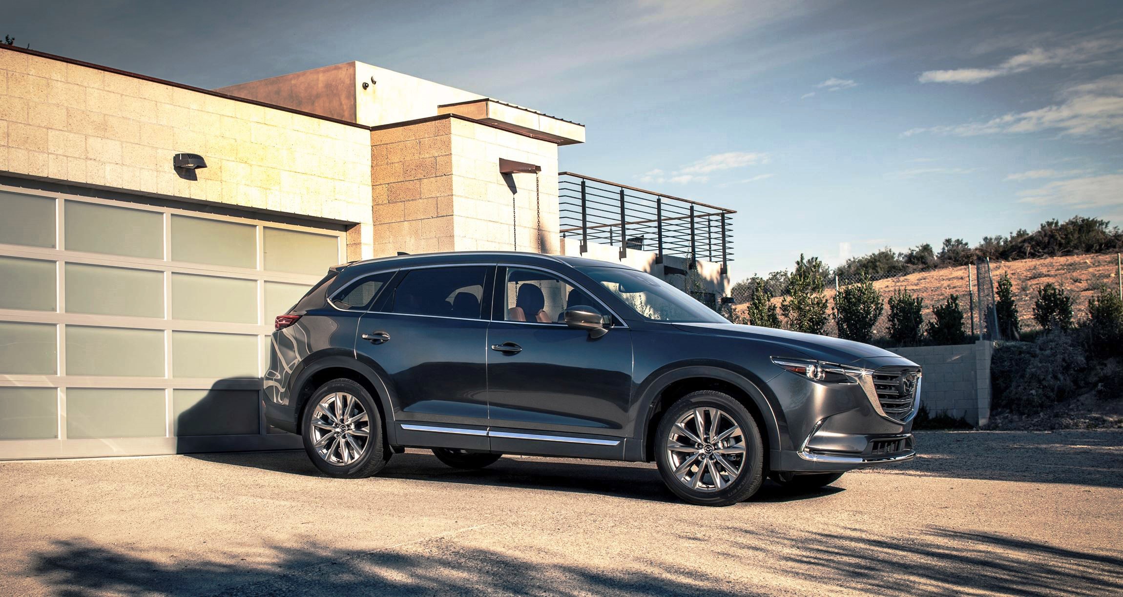 Description: A black car parked in front of a garage door and a building with a balcony on top of it.