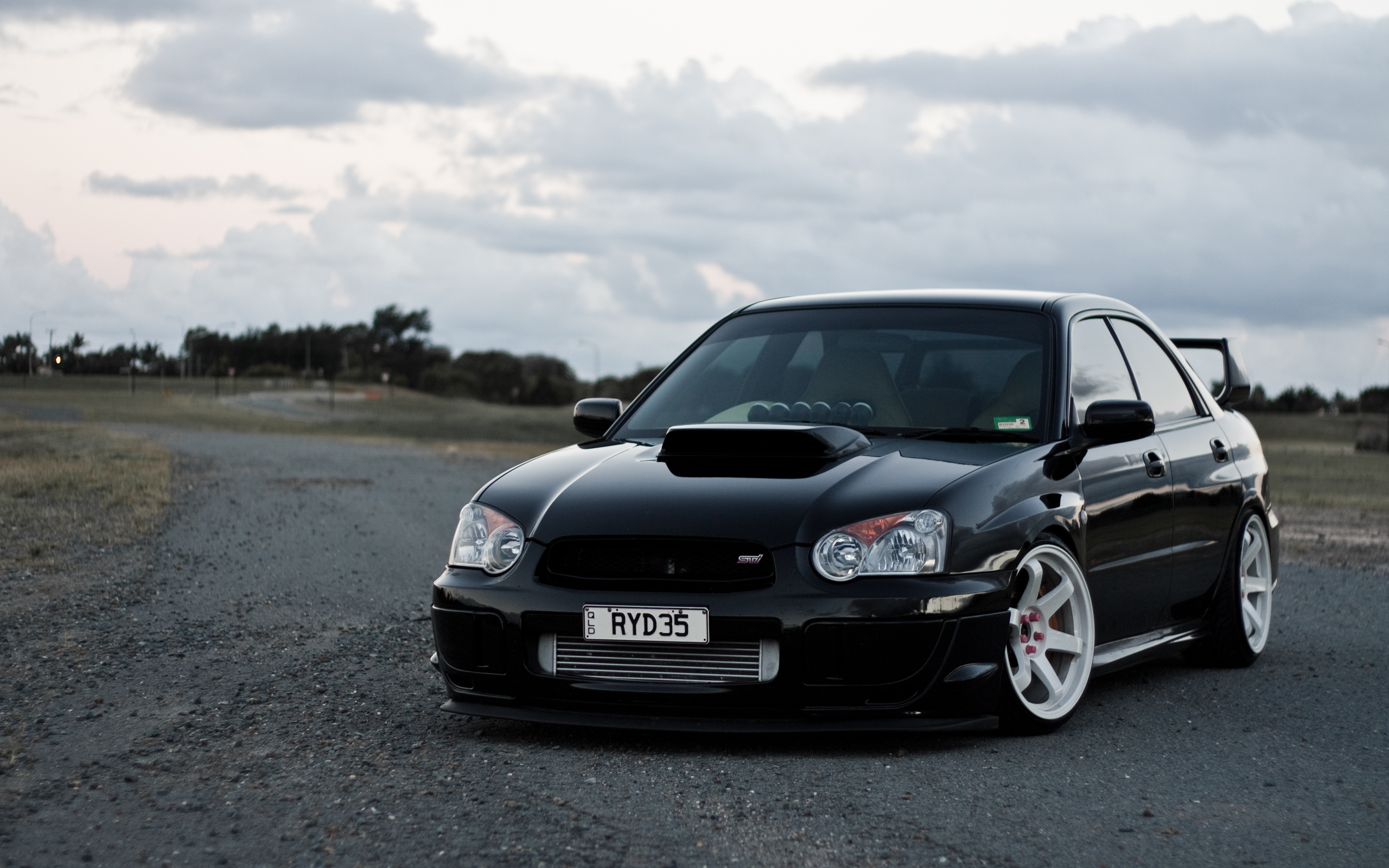Description: A black car parked on a gravel road next to a field and trees with a cloudy sky in the background.