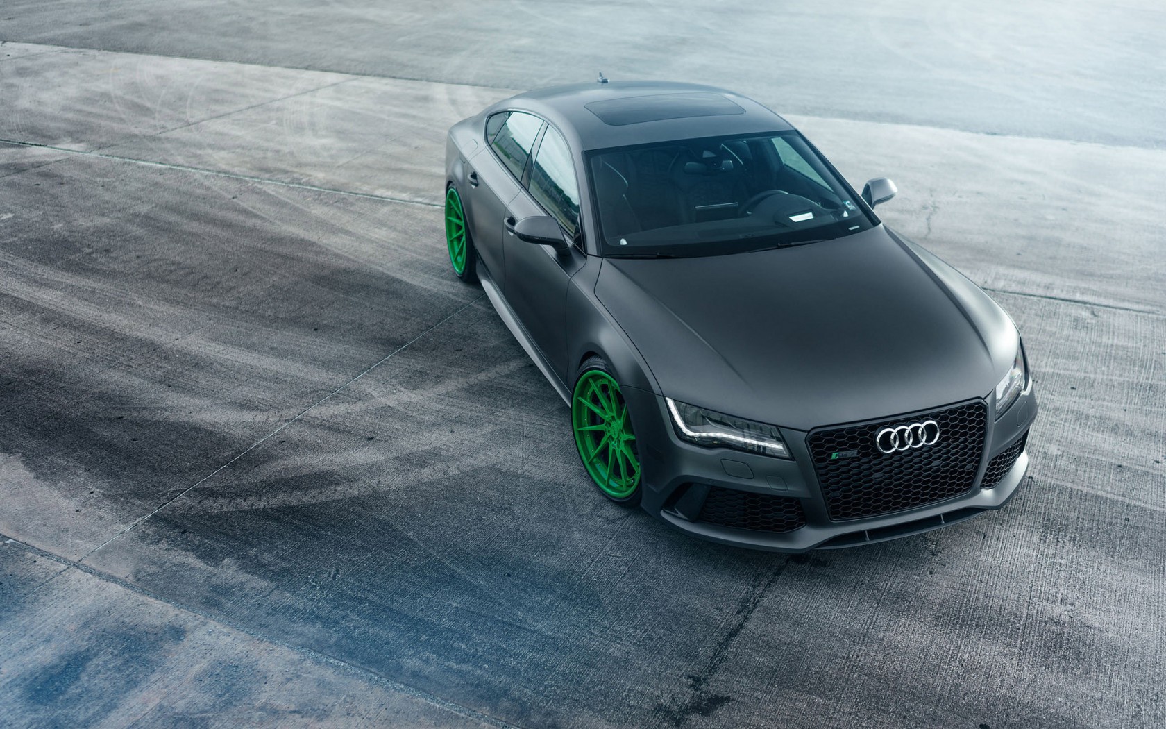 Description: A black car with green rims parked on a concrete surface with a sky background and a shadow of a car.
