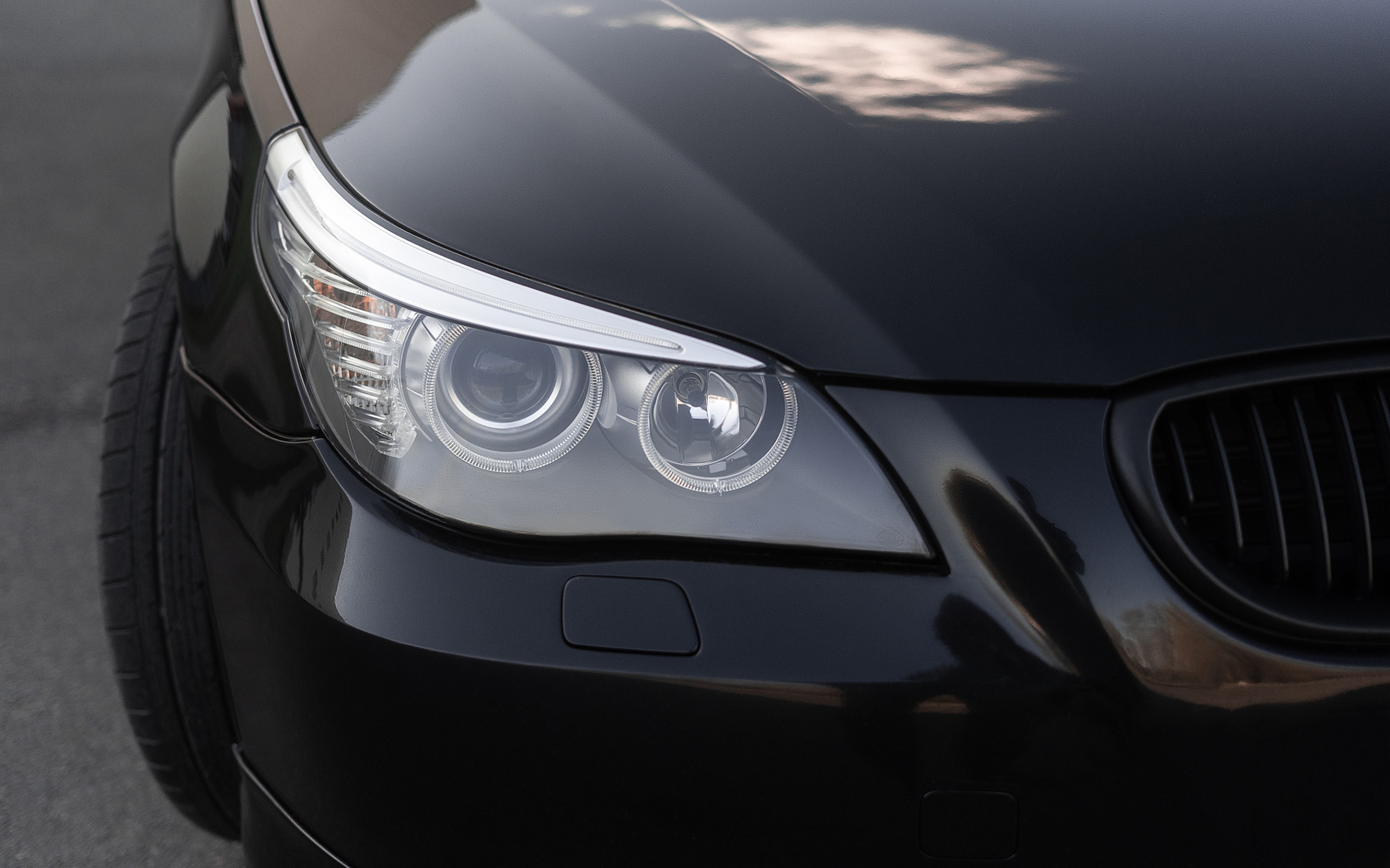 Description: A close up of a black car with a light on it's headlight and a black car with a white stripe.